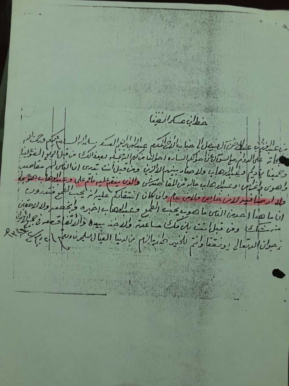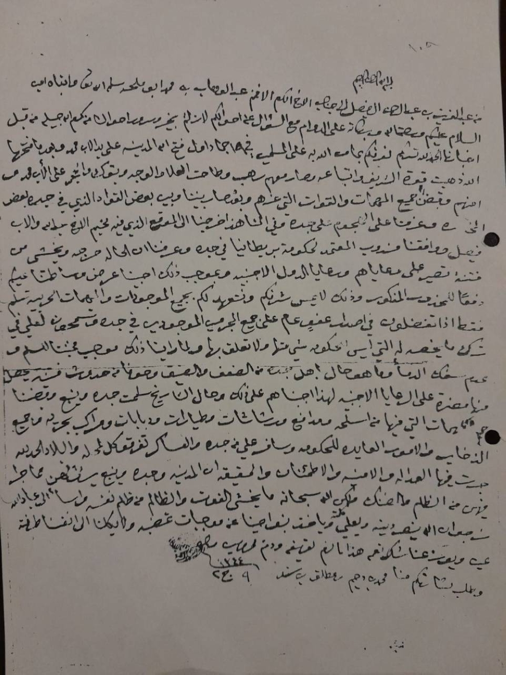 ذكرت عن اجتماعكم مع كبار طورافنا واجتماع رأيكم على تنويب محمد بن جيفان مكانه إلى وصول أميرنا رأيكم إن شاءالله أن عبدالعزيز بن إبراهيم وصلكم وتولى شغله والذي في خاطري جميعها عنده وهو إن شاءالله فيه بركة، كما أنني أوصيته من طرفك مخصوص وأخبرته بمقامك عندي وهو يدري عن أفعالك الطيبة ومازلت مذكور خير كذلك.