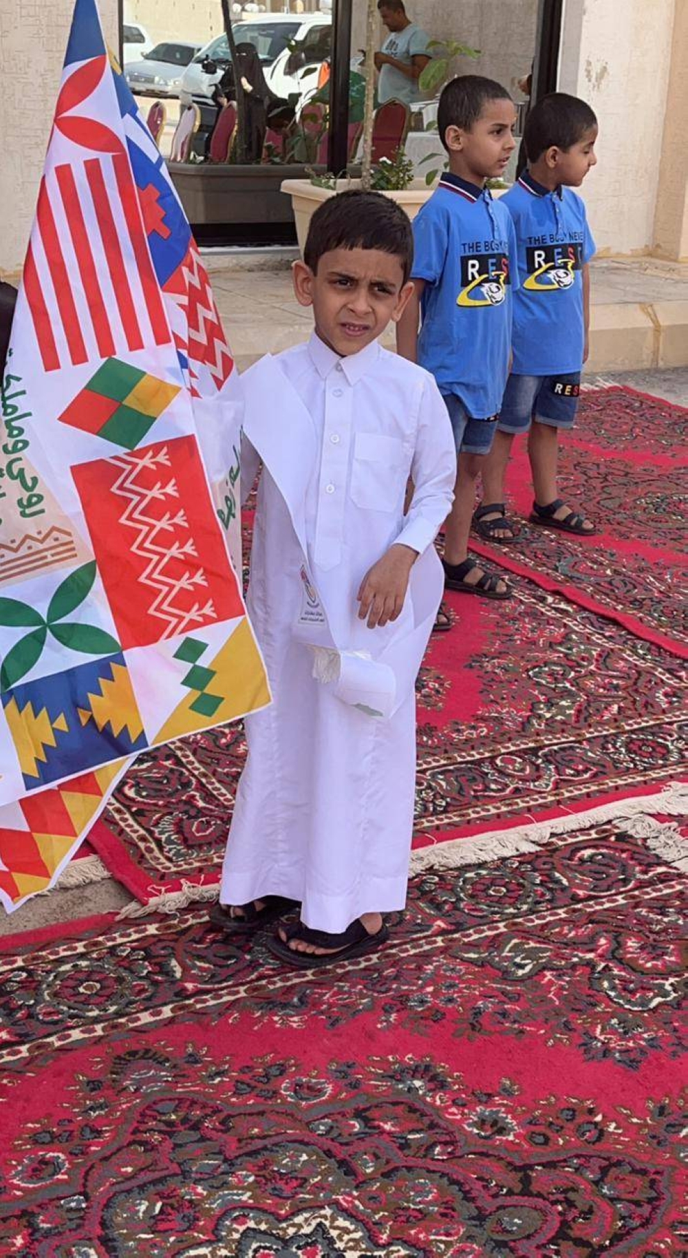وفي هذه الأثناء، خرج الطفل تيم العنزي مرحبا بالحاضرين، قائلا "نحبك يا وطن"، فكان حضوره مبهرا ومسعدا للجميع حيث قام الحاضرين بالسلام عليه وأداء العرضة معه، أما الطفل يزن ياسين، فقد كان حضوره لافتا حيث كان لابسا البشت السعودي والرايات الخضراء مرددا "أنت لنا وطن"، أما زهرة الاحتفال الطفلة جنى، فقد عبرت سعادتها بكلمات جميلة مبدية حبها للوطن وقالت "هذا السعودي فوق فوق".