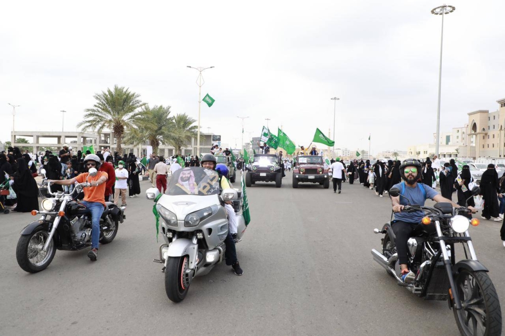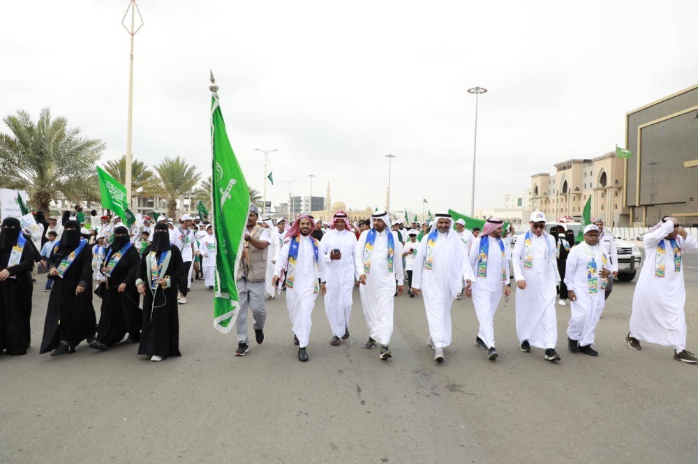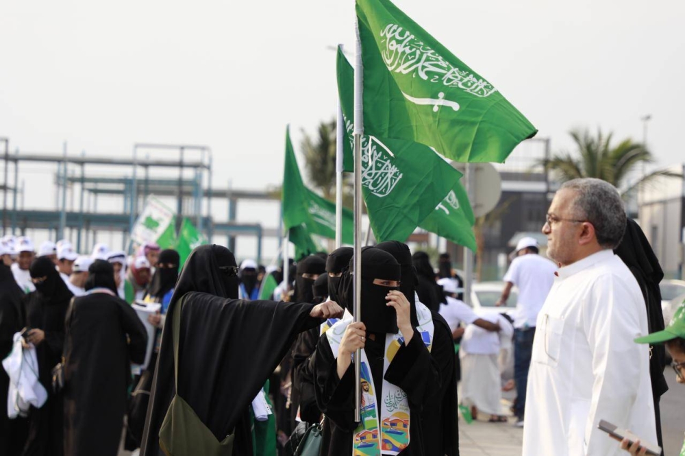 وتوشحت المسيرة الوطنية بالأعلام والعبارات الوطنية، إضافة إلى صور القيادة، وترديد الأهازيج والأغاني الوطنية، وتضمنت المسيرة تنفيذ خطة لإدارة الحشود، وتفويج المشاركين والمشاركات.