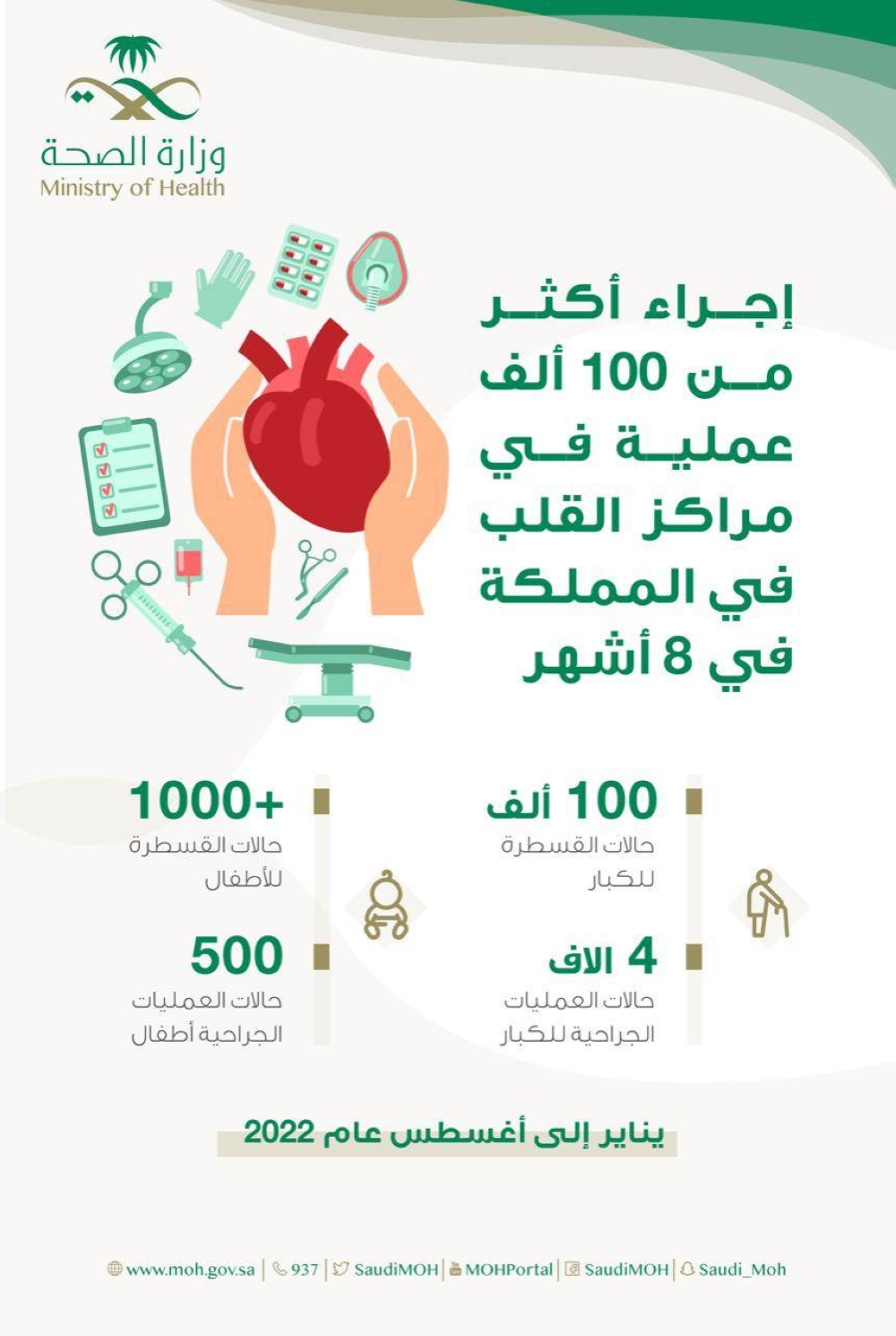 كما بينت "الصحة أنه تم تنفيذ عدد من المشاريع الخاصة في مراكز القلب في عدد من المناطق، من عام 2019 – 2022، تمثلت في تجهيز وتدريب وتشغيل غرفة عمليات جراحة القلب في مستشفى الملك فهد في منطقة الباحة، تجهيز وتدريب وتشغيل غرفة عمليات جراحة القلب في مستشفى الملك عبد العزيز في محافظة الطائف، تجهيز وتدريب وتشغيل غرفة عمليات جراحة القلب في مركز الأمير فيصل بن خالد في مدينة أبها، تجهيز وتدريب وتشغيل معمل القسطرة في مستشفى حفر الباطن المركزي ، وتجهيز وتدريب وتشغيل معمل القسطرة في مستشفى الملك عبد الله في بيشة.