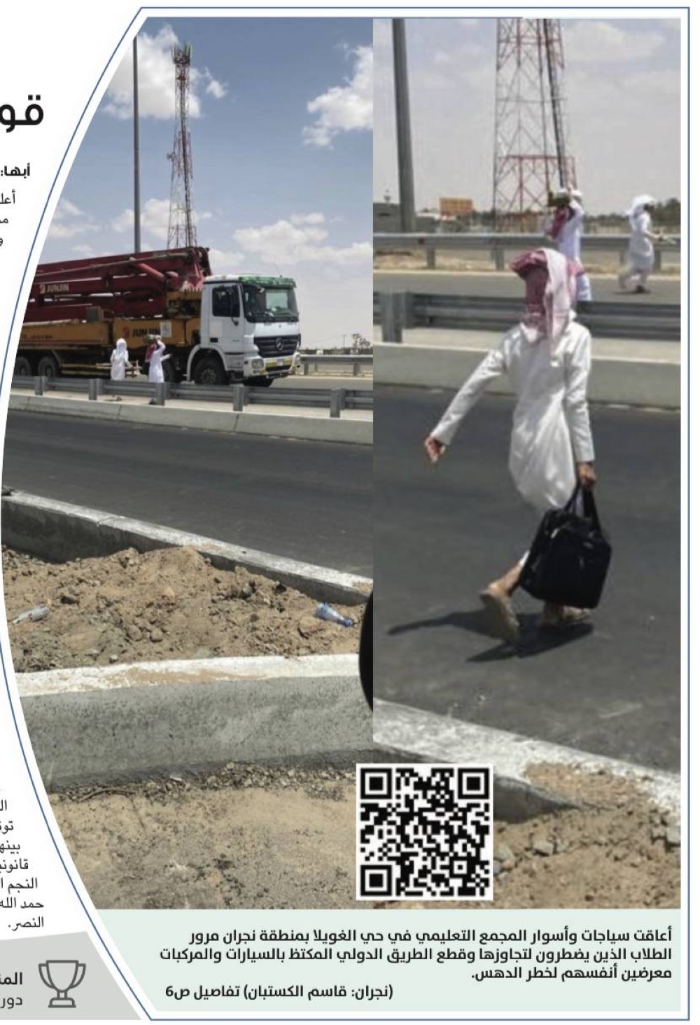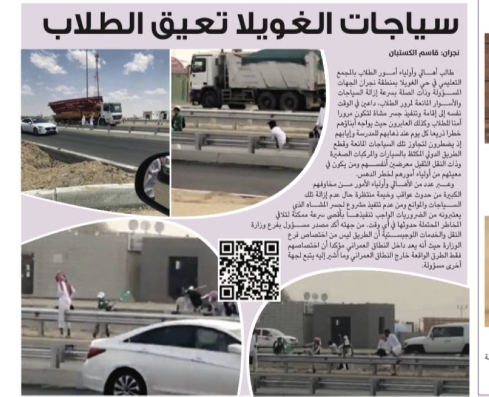 وكان أقرب تقاطع ودوران يبعد قرابة من الـ 20/15 كم حسب ما أفاد به الأهالي وأولياء أمور الطلاب وكذلك منسوبو المجمع التعليمي الذين سبق وطالبوا مرارا بإيجاد حلول عاجلة لدرء الخطر الذي يواجهه الطلاب وأولياء أمورهم يوميا بتجاوزهم تلك السياجات والحواجز الخرسانية وقطع الطريق الدولي ذهابا وإيابا لكي يختصروا الوصول للمجمع من الجانب الآخر، مطالبين بعمل ممر ودوران يسهل لأولياء الأمور توصيل أبنائهم أمام المدرسة. كما أفادوا بأنهم طالبوا بعمل وتتفيذ جسر مشاة للضرورة الملحة في ذلك خدمة للطلاب والأهالي كونه يشهد كثافة سكانية، وسيكون المرور عليهم ميسرا بوجود الجسر في حال تتفيذه، فيما أشار أحد منسوبي المجمع التعليمي إلى أن ما نسبته 56% من الطلاب يقطنون في الجهة المقابلة للمجمع التعليمي.