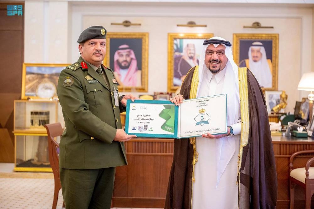استقبل أمير منطقة القصيم الأمير الدكتور فيصل بن مشعل، مدير جوازات المنطقة اللواء ماجد الفغم، الذي سلمه التقرير السنوي الإحصائي لجهود جوازات المنطقة لعام 1443.