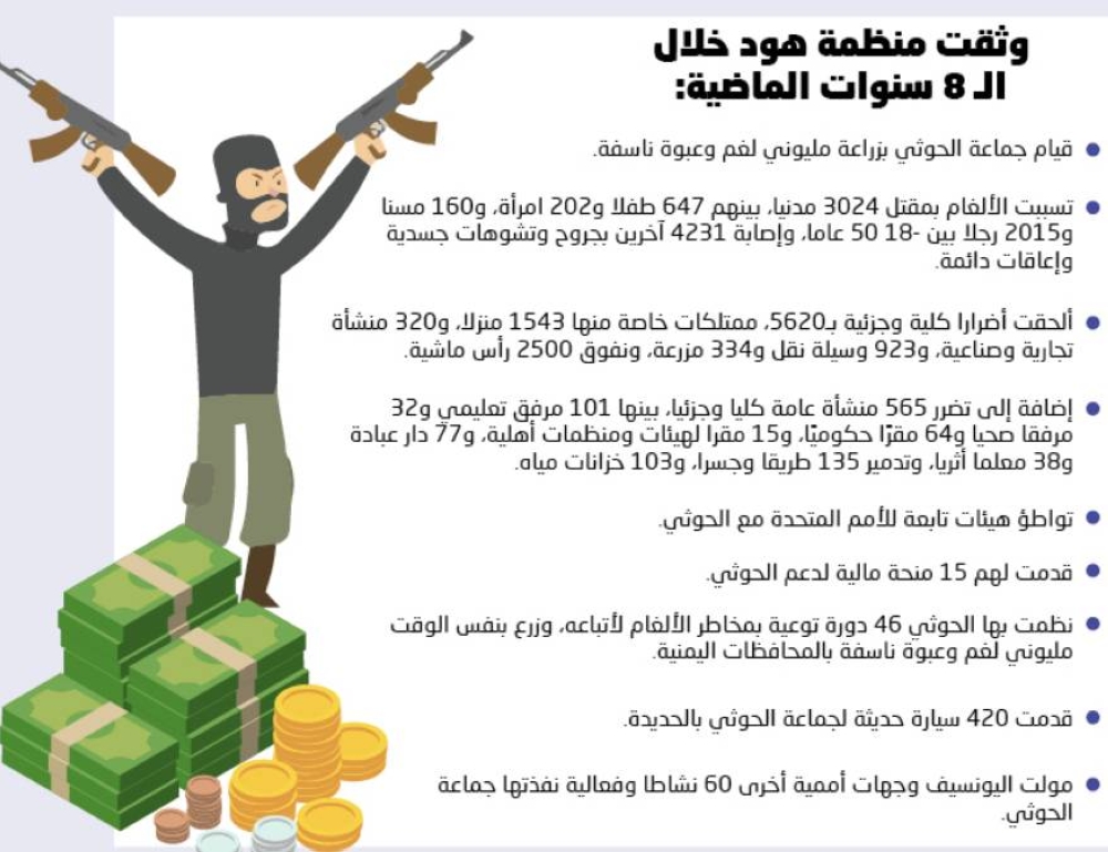 نظمت بها الحوثي 46 دورة توعية بمخاطر الألغام لأتباعه، وزرع بنفس الوقت مليوني لغم وعبوة ناسفة بالمحافظات اليمنية.