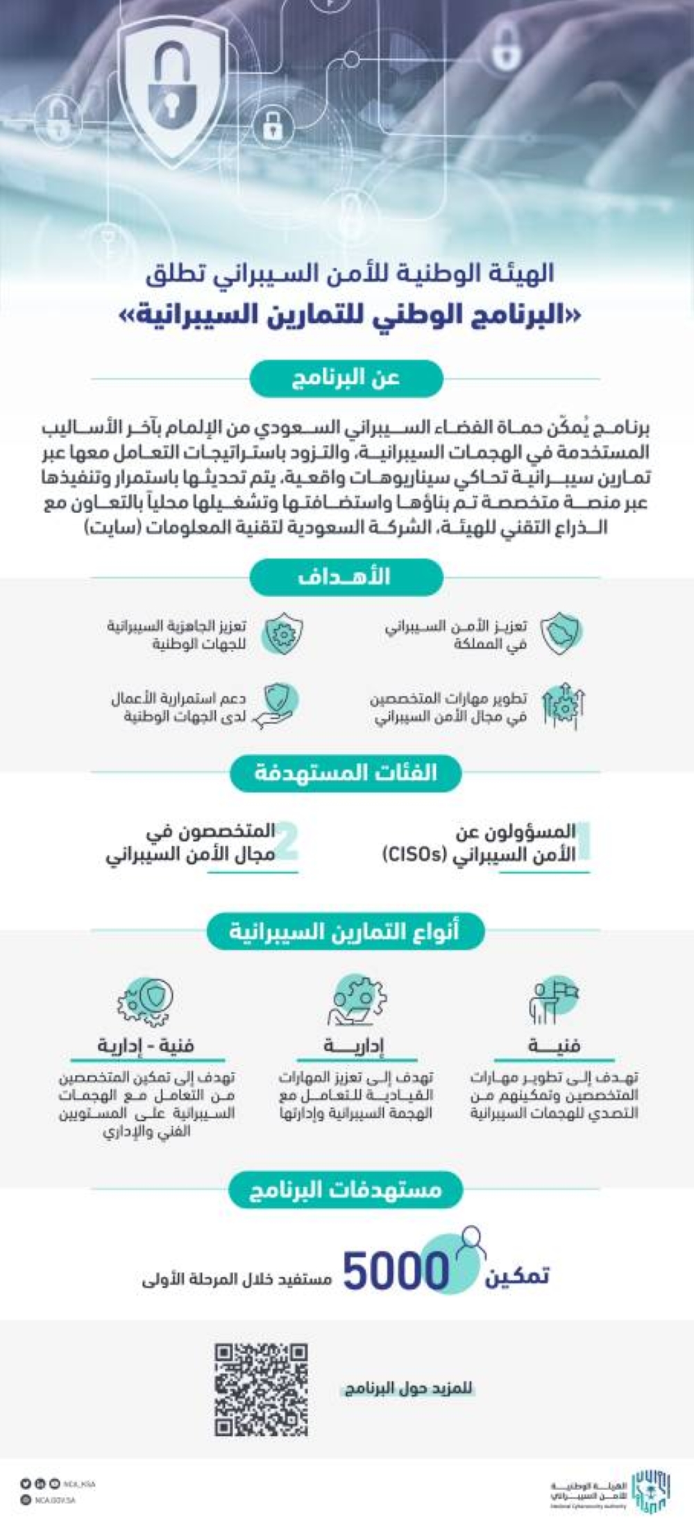 ويأتي إطلاق البرنامج الوطني للتمارين السيبرانية امتداداً لجهود الهيئة في تنفيذ التمارين السيبرانية للجهات الوطنية، حيث تستهدف الهيئة تدريب أكثر من 5000 مستفيد من الجهات الوطنية خلال المرحلة الأولى من البرنامج، بما يُسهم في تطوير قدرات الجهات الوطنية المختلفة وتعزيز صمودها تجاه التهديدات المتجددة، ورفع جاهزيتها للتعامل مع الحوادث السيبرانية الطارئة.