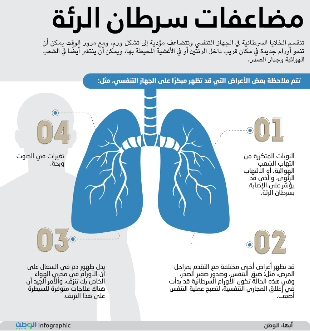 النوبات المتكررة من التهاب الشعب الهوائية، أو الالتهاب الرئوي، والذي قد يؤشر على الإصابة بسرطان الرئة.