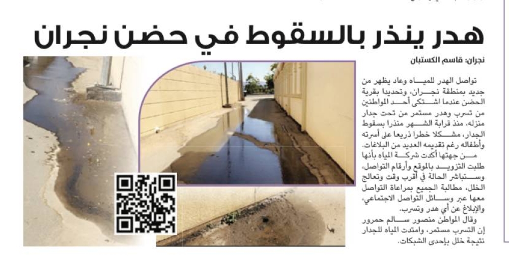 تجاوبت شركة المياه فرع منطقة نجران مع ما نشرته «الوطن» في عددها الصادر الثلاثاء 22 نوفمبر 2022 بعنوان «هدر ينذر بالسقوط» وقامت بإرسال فرقة صيانة للموقع لمعالجة الخلل وإصلاحه وإيقاف الهدر والتسرب الذي كان ينذر بسقوط جدار أحد منازل المواطنين الذي اشتكى من التسرب لأكثر من شهر، حيث قامت فرق الصيانة بالحفر واكتشاف الخلل ومعالجة الأمر وفي وقت سريع.