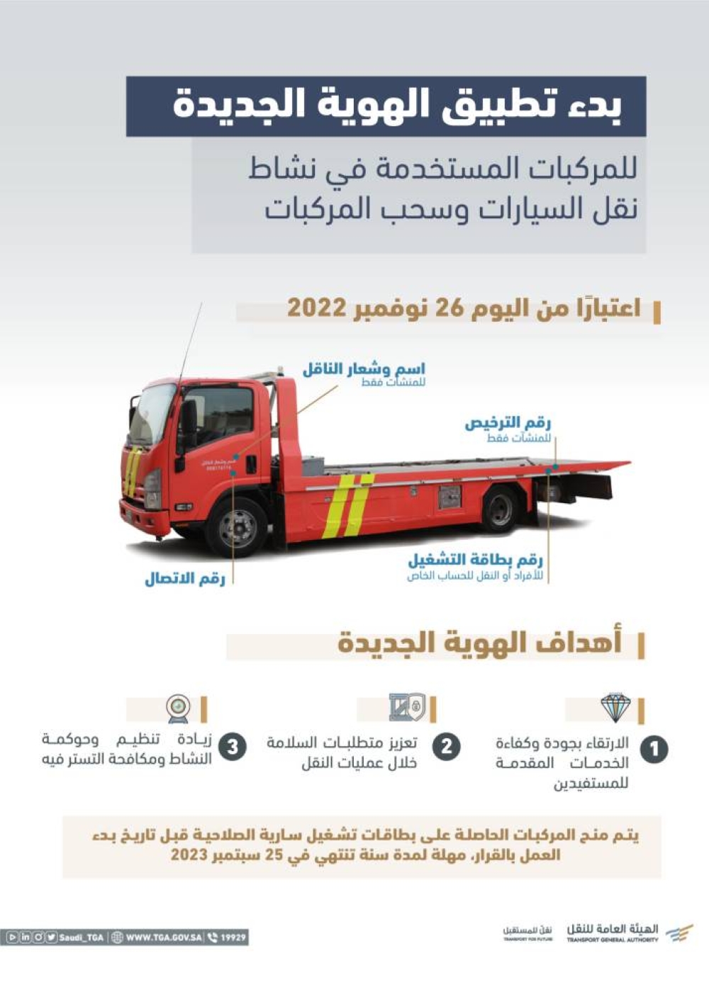 وتتضمن الهوية الجديدة اللون الموحد، والعلامات والبيانات المطلوب وضعها على المركبات التي تعمل في نشاط نقل السيارات وسحب المركبات في المملكة، مع استثناء "مدة سنة" للحاصلين على بطاقات تشغيل سارية الصلاحية وقبل تاريخ التطبيق الفعلي للهوية الجديدة.