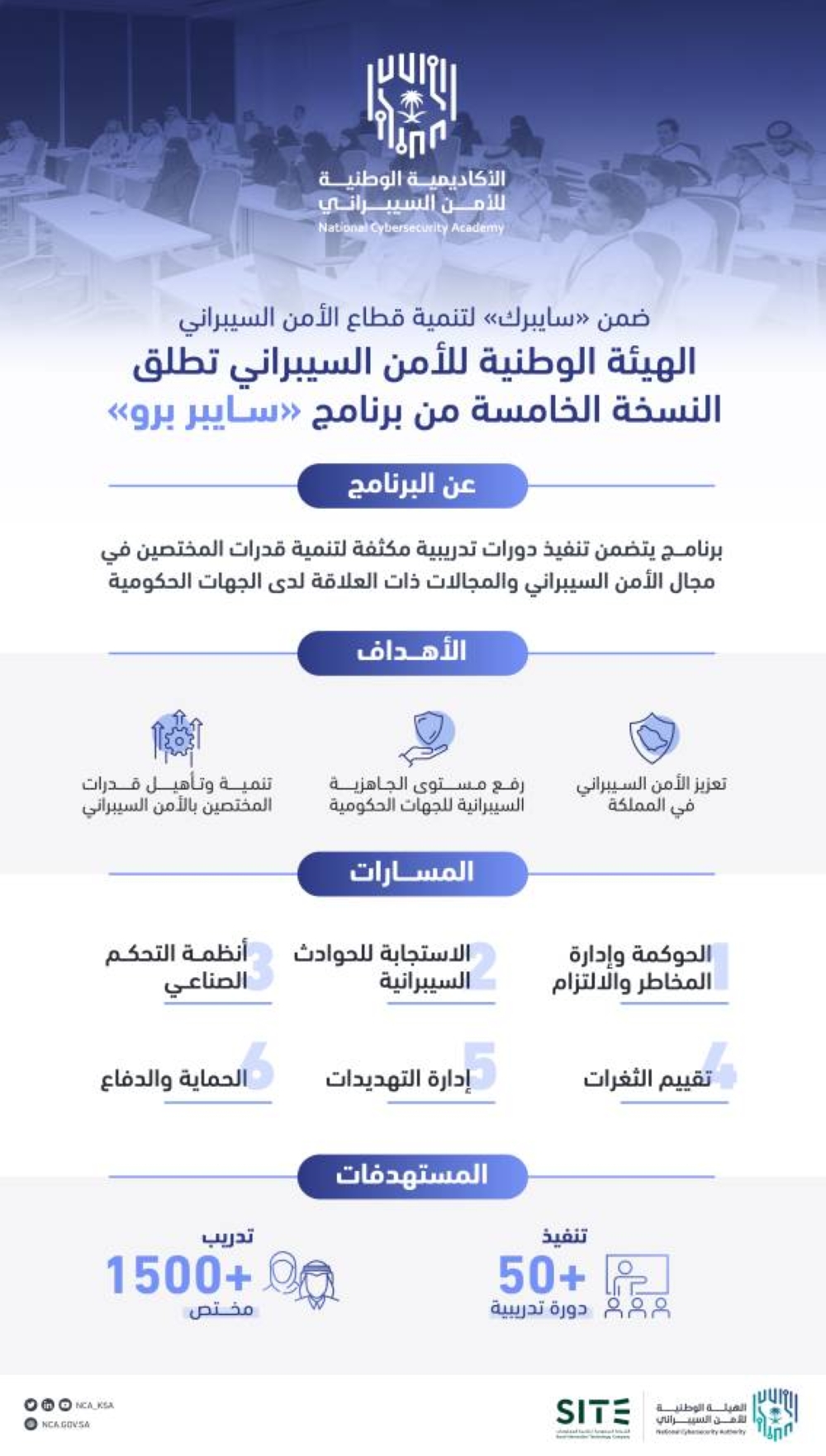 وأوضحت الهيئة أن البرنامج يرتكز على ستة مسارات، هي «الحوكمة وإدارة المخاطر والالتزام، الحماية والدفاع، إدارة التهديدات، تقييم الثغرات، الاستجابة للحوادث السيبرانية، أنظمة التحكم الصناعي»، ويتضمن تنفيذ أكثر من 50 دورة تدريبية مكثفة تتوزع على أربعة مستويات، كما يركّز على تهيئة المشاركين فيه للحصول على شهادات احترافية ضمن مساراته الستة، لافتة إلى أن البرنامج يأتي في إطار جهودها الرامية إلى تعزيز الأمن السيبراني في المملكة، ورفع مستوى الجاهزية السيبرانية والالتزام بضوابط الأمن السيبراني لدى الجهات الوطنية لتحقيق رؤيتها الرامية إلى فضاء سيبراني سعودي آمن وموثوق يمكّن النمو والازدهار.