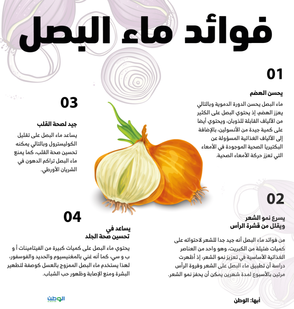 ماء البصل يحسن الدورة الدموية وبالتالي يعزز الهضم، إذ يحتوي البصل على الكثير من الألياف القابلة للذوبان، ويحتوي أيضا على كمية جيدة من الأنسولين، بالإضافة إلى الألياف الغذائية المسؤولة عن البكتيريا الصحية الموجودة في الأمعاء التي تعزز حركة الأمعاء الصحية.