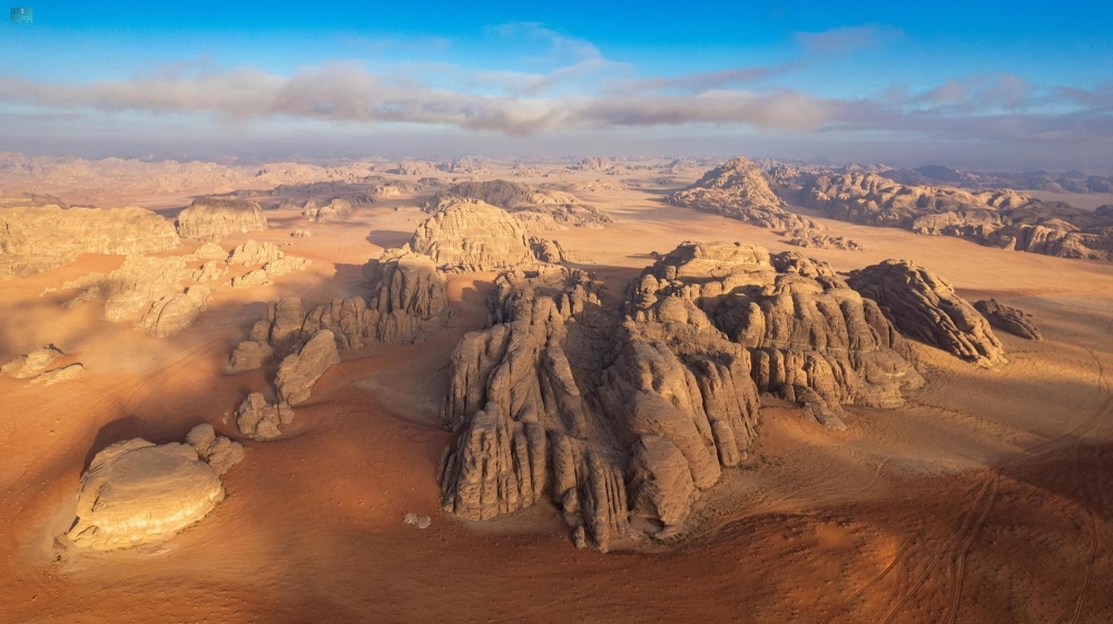 تُضفي الجبال الرملية على صحراء حسمى بمنطقة تبوك شمال غرب المملكة جمالاً طبيعيًا وبُعدًا جيولوجيًا للمكان الذي تنتشر فيه الجبال الحاضرة في سجل التاريخ، والتي يعود عمرها لأكثر من 500 مليون عام، بحسب الخبير الجيولوجي البروفيسور عبدالعزيز بن لعبون، الذي أكّد أن هذه الجبال قد تكونت أشكالها عبر تلك السنين، فشكلت مناظر جاذبة للسياح والسياحة، لتصبح كالمتحف المفتوح، لا يمل منه الزائر أينما اتجه. (واس)