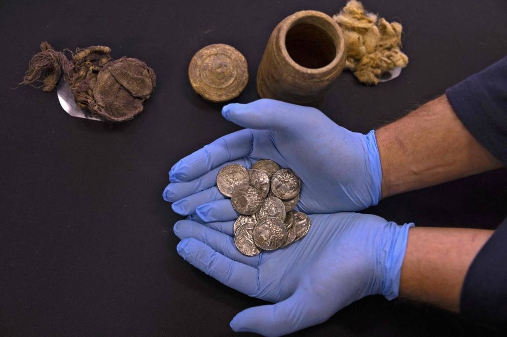 15 قطعة نقدية فضية تحمل صورة ملك مصر الهلنستي بطليموس السادس فيلوميتور (حكم من 186 إلى 145 قبل الميلاد)، عثر عليها في صندوق خشبي تم اكتشافه في موقع تنقيب في كهف المرابط في صحراء يهودا المطلة على البحر الميت. (أ ف ب)
