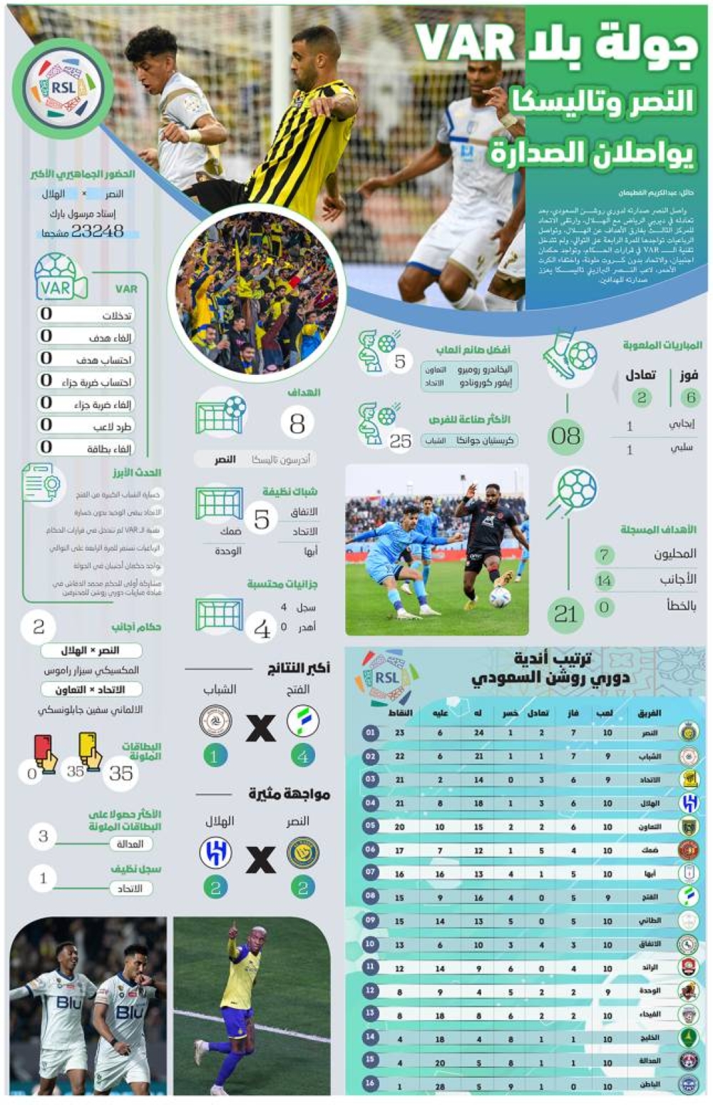 واصل النصر صدارته لدوري روشن السعودي، بعد تعادله في ديربي الرياض مع الهلال، وارتقى الاتحاد للمركز الثالث بفارق الأهداف عن الهلال، وتواصل الرباعيات تواجدها للمرة الرابعة على التوالي، ولم تتدخل تقنية الـ VAR في قرارات الحكام، وتواجد حكمان اجنبيان، والاتحاد بدون كروت ملونة، واختفاء الكرت الأحمر، ولاعب النصر البرازيلي تاليسكا يعزز صدارته للهدافين.