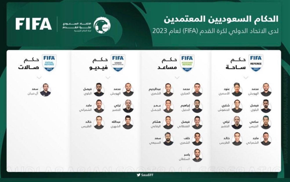 اختار الاتحاد السعودي لكرة القدم، قائمة الحكام السعوديين المعتمدين دوليًا لعام 2023، وتواجد بها 8 حكام ساحة، و9 حكام مساعدين، و6 حكام فيديو، وحكم لكرة القدم الصالات، وتعتبر العنود الأسمري أول سيدة حكمة سعودية دولية في 2023 التي جاءت ضمن اعتماد اتحاد القدم السعودي.
