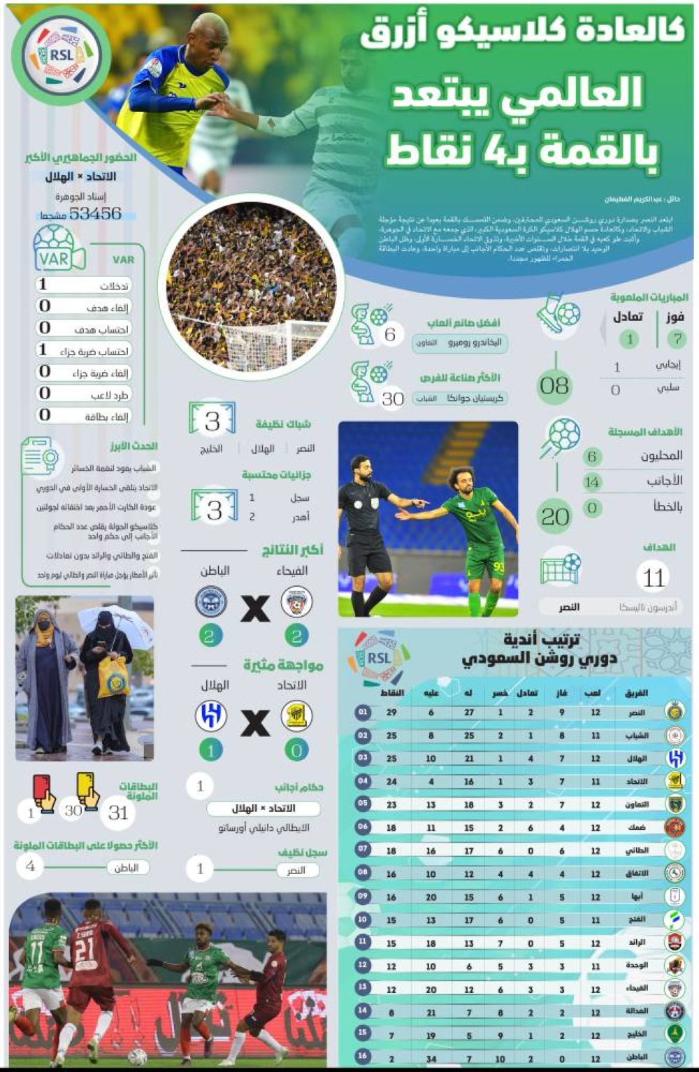 ابتعد النصر بصدارة دوري روشن السعودي للمحترفين، وضمن التمسك بالقمة بعيدا عن نتيجة مؤجلة الشباب والاتحاد، وكالعادة حسم الهلال كلاسيكو الكرة السعودية الكبير، الذي جمعه مع الاتحاد في الجوهرة، وأثبت علو كعبه في القمة خلال السنوات الأخيرة، وتذوق الاتحاد الخسارة الأولى، وظل الباطن الوحيد بلا انتصارات، وتقلص عدد الحكام الأجانب إلى مباراة واحدة، وعادت البطاقة الحمراء للظهور مجددا.