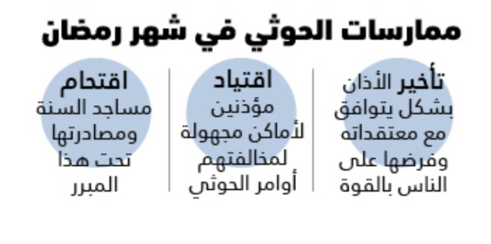 أضاف المصدر بأن الحوثيين وجهوا المؤذنين التابعين لهم بتأخير الأذان الذي يفطر الناس على صوته في رمضان بشكل يتوافق مع معتقداتهم الطائفية وفرضها على الناس بالقوة القهرية، وقام الحوثيون باقتياد عدد من المؤذنين الملتزمين بأوقات الصلاة في مواعيدها في اليوم الثاني من شهر رمضان إلى أماكن مجهولة وغير معروفة بتهمة أذان المغرب في موعده.