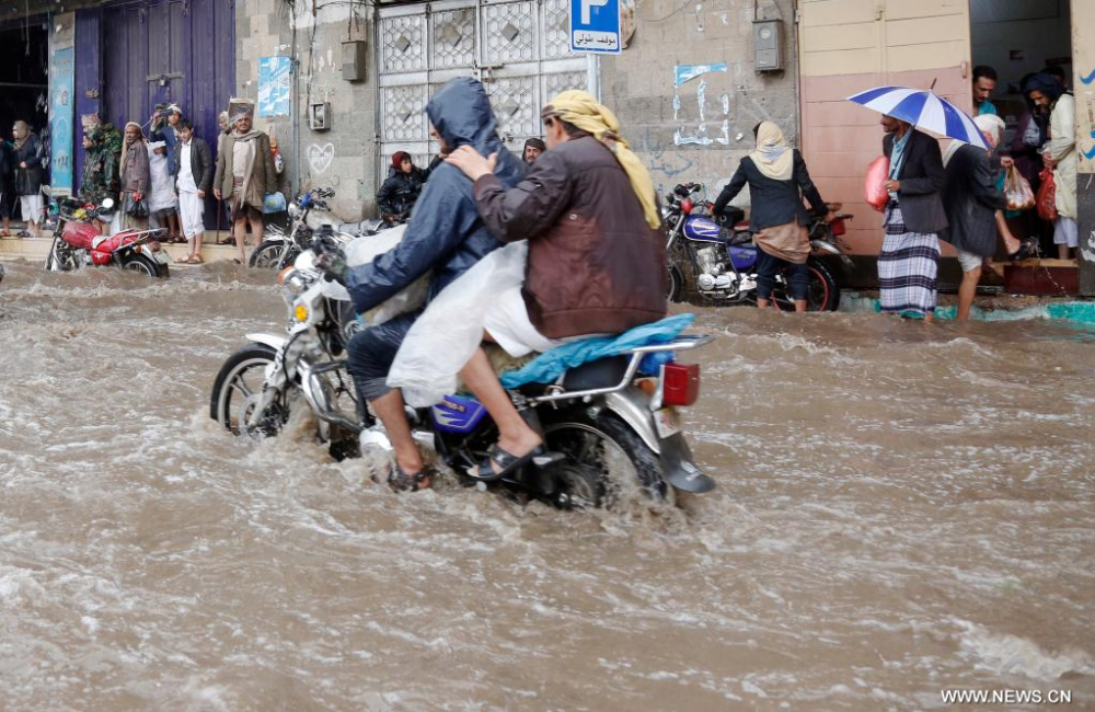 يمنيان يقودان دراجة نارية عبر شارع مغمور بمياه الفيضانات الناجمة عن الأمطار الغزيرة بالعاصمة اليمنية، صنعاء. (شينخوا)