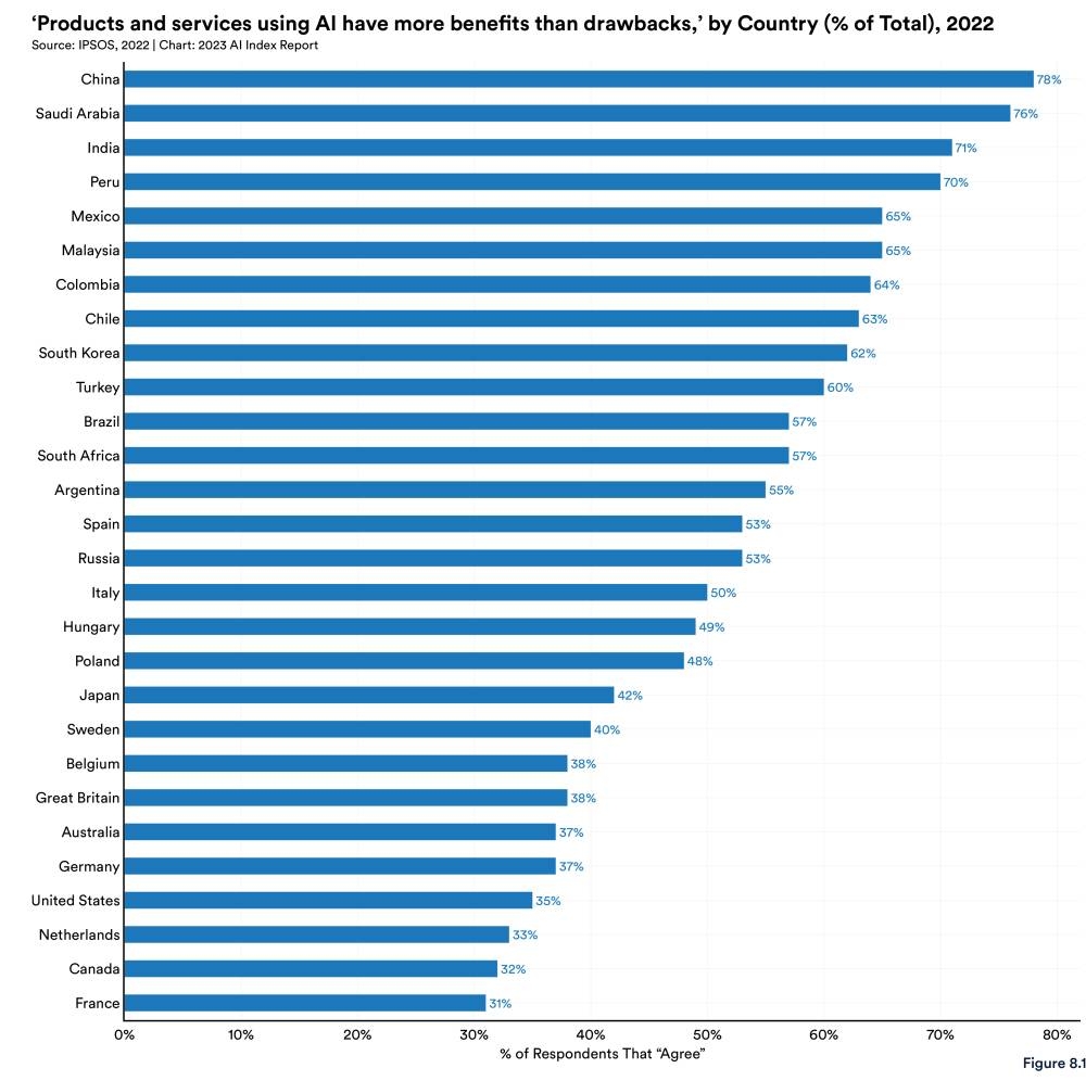 ويعد هذا التقرير بمثابة مصدر شامل لواضعي السياسات والباحثين والمتخصصين في الصناعة لفهم الوضع الحالي للذكاء الاصطناعي والاتجاهات المستقبلية بشكل أفضل، وبين أن المملكة توجت بالمرتبة الثانية عالمياً بعد الصين في جانب إيجابية وتفاؤل المواطنين السعوديين تجاه منتجات وخدمات الذكاء الاصطناعي المقدمة بالمملكة خلال المرحلتين الحالية والمستقبلية.