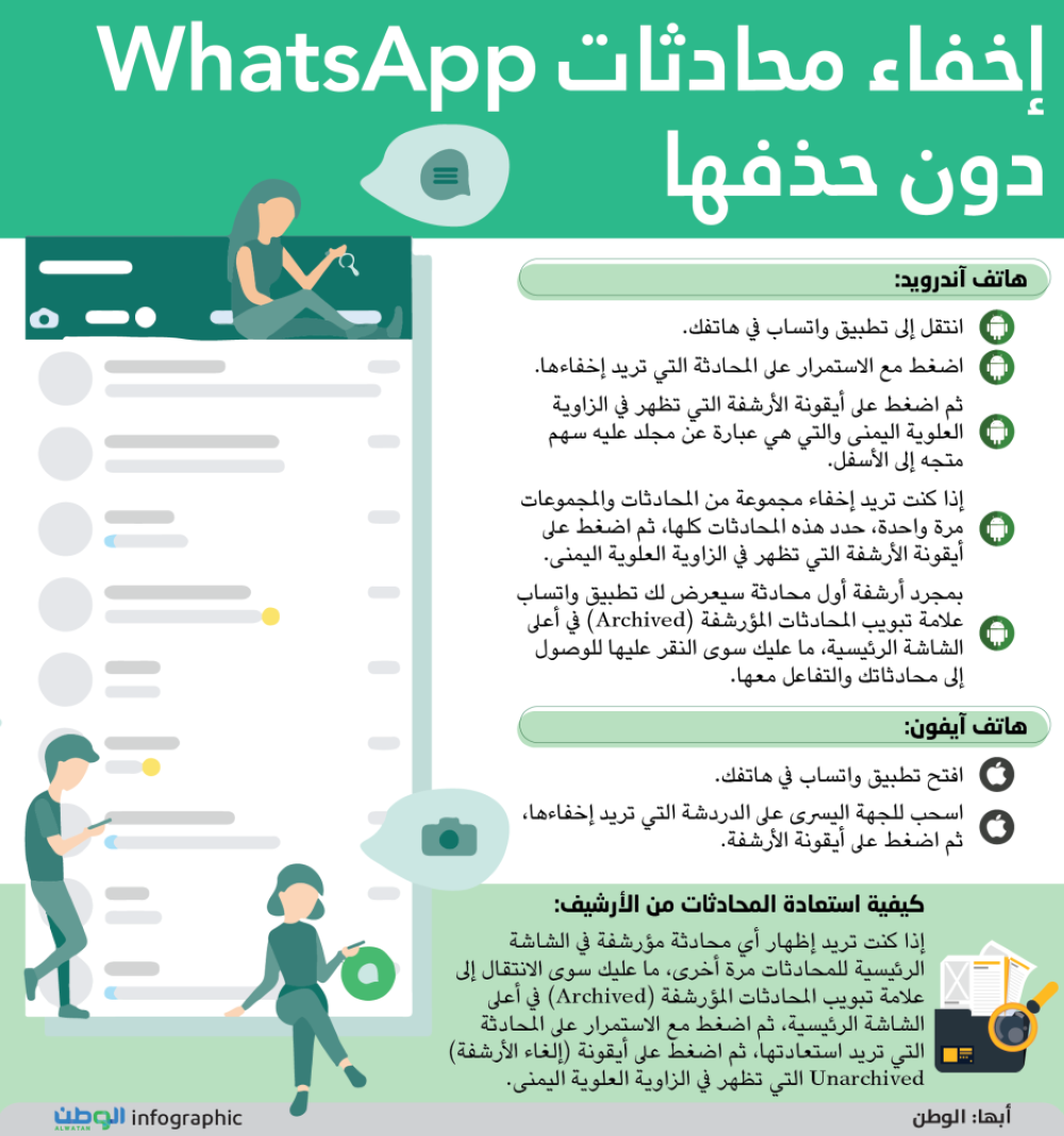 إذا كنت تريد إظهار أي محادثة مؤرشفة في الشاشة الرئيسية للمحادثات مرة أخرى، ما عليك سوى الانتقال إلى علامة تبويب المحادثات المؤرشفة (Archived) في أعلى الشاشة الرئيسية، ثم اضغط مع الاستمرار على المحادثة التي تريد استعادتها، ثم اضغط على أيقونة (إلغاء الأرشفة) Unarchived التي تظهر في الزاوية العلوية اليمنى.