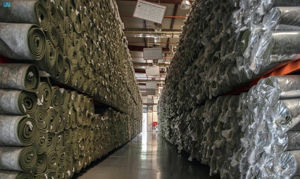 ويوجد داخل المستودع (26) ألف سجادة جاهزة للنقل إلى المسجد الحرام كل ثلاثة أيام، ويشرف فريق متخصص على هذه الأعمال للتأكد من التنفيذ وفق أصول فنية متبعة، والتأكد من خلوها من أي عيوب.