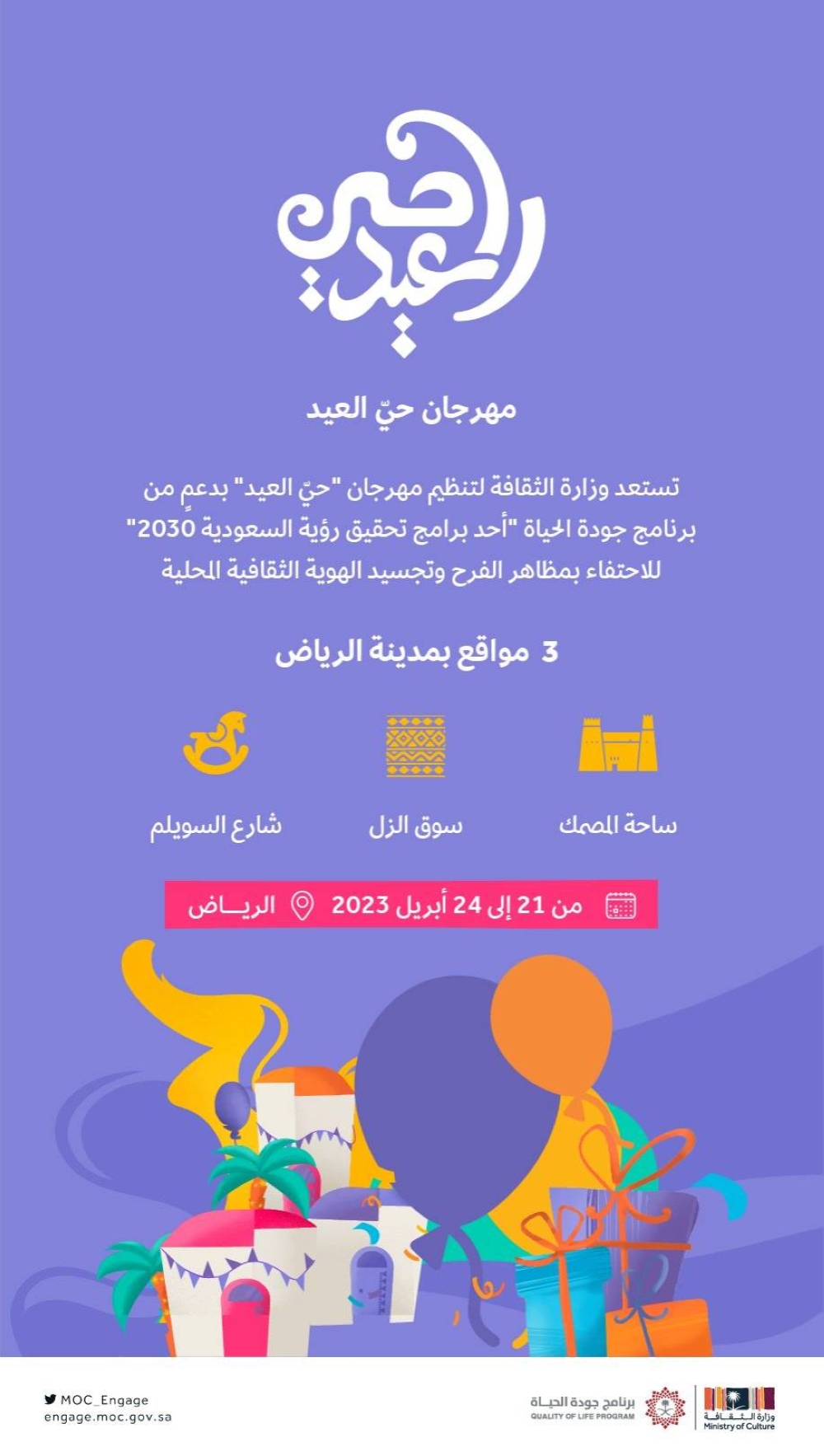 وسيوفر المهرجان جداريةً بهوية مهرجان "حيّ العيد" ليعبر من خلالها الزوّار عن مشاعرهم بهذه المناسبة السعيدة، وفعالية "عيدية" المتمثلة في أعمال فنية جدارية تُعرف الزائر بالعيديات وكيف كانت تُقدم في الزمن القديم وطريقة تقديمها في الوقت الحاضر، لتنتقل الرحلة بعدها إلى منطقة "عيدنا في جمعتنا" وهي عبارة عن ساحة خارجية تحتوي على جلسات مميزة بطابع المهرجان متضمنةً عدة أنشطة، وهي: حوامة العيد التي ستقام في شارع السويلم ثلاث مرات باليوم وتوزع خلالها الحلوى؛ لتُحاكي في مشهدٍ تمثيلي عادة الحوامة القديمة في نجد، بحيث كان الأطفال يحومون انطلاقاً من مسجد الحيّ ومروراً بالبيوت منشدين خلالها أهازيج مختلفة مرتبطة بهذه المناسبة السعيدة، وموسيقى حيّة وبائع البالون؛ لتحيي من خلالها الوزارة الموروث الثقافي المرتبط بالعيد، وسط أجواء موسيقية تُنشر البهجة والسرور.