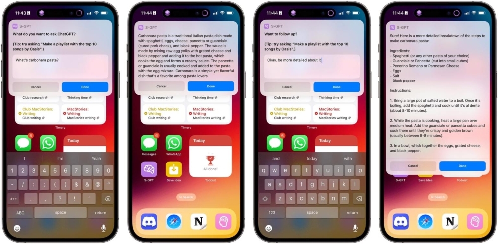 مع ذلك، يريد بعض المطورين المضي قدمًا إلى الأمام ويعملون على دمج تطبيقاتهم بشكل أفضل مع النظام. كانت هناك بالفعل محاولات قليلة لجعل هذه التطبيقات متوافقة مع Siri من خلال الاختصارات. لذلك يمكن للمستخدمين طرح الأسئلة على ChatGPT (أو أي نموذج آخر) من خلال الصوت أو حتى الرسائل النصية. يمنحهم هذا ميزة في الحالات التي يتعذر فيها على Siri فهم استعلام المستخدم، يمكنهم فقط استخدام لوحة المفاتيح لكتابة سؤال للروبوت الذي يعمل بالذكاء الاصطناعي.