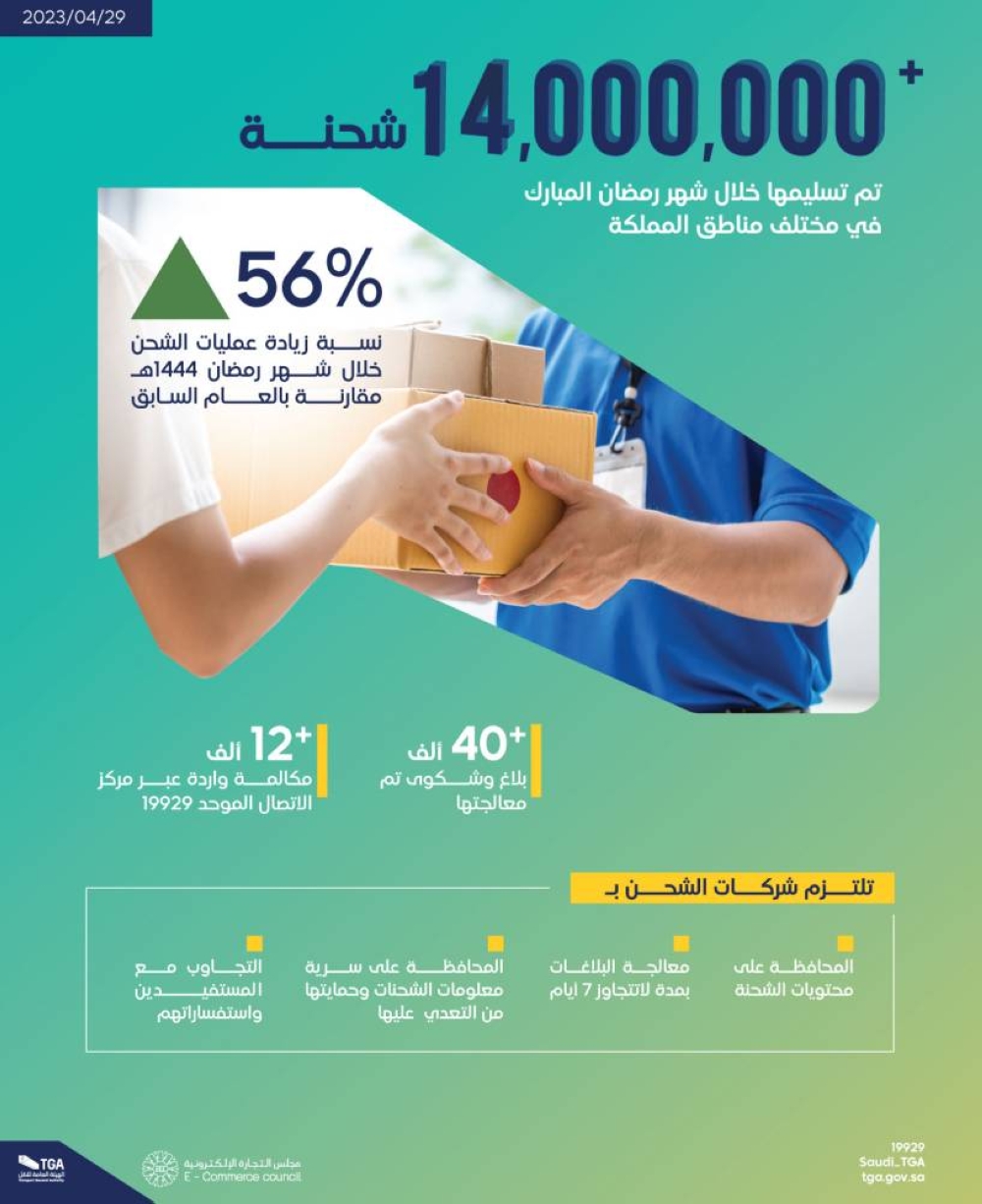 أوضحت الهيئة العامة للنقل عن تجاوز عدد الشحنات التي سلمتها الشركات المرخصة في قطاع توصيل الطرود أكثر من 14 مليون شحنة خلال شهر رمضان المبارك 1444هـ في مختلف مناطق المملكة، بنسبة زيادة عمليات الشحن خلال شهر رمضان بـ 56% مقارنةً بالعام الماضي. كما تلقّت الهيئة من خلال مركز الاتصال الموحد أكثر من 12 ألف مكالمة واردة وأكثر من 40 ألف بلاغ وشكوى عبر الرقم الموحد والموقع الالكتروني للهيئة ، كما عملت الهيئة مع شركات الشحن لرفع مستوى الخدمة، وإلزامها بالمحافظة على محتويات الشحنة ومعالجة بلاغات المستفيدين خلال 7 أيام والمحافظة على سرية معلومات الشحنات وحمايتها من التعدي عليها والتجاوب مع المستفيدين واستفساراتهم. وتهيب الهيئة بجميع الشركات المرخصة والناقلين الالتزام بتطبيق كافة الاشتراطات والأنظمة التي تضمن تقديم خدمات نقل ذات جودة وأمان عاليين، وتدعو جميع الراغبين في الاستفادة من خدمات النقل، كما تسعد باستقبال الاستفسارات والاقتراحات من خلال الاتصال على الرقم الموحد 19929 أو زيارة الموقع الالكتروني tga.gov.sa. // انتهى //