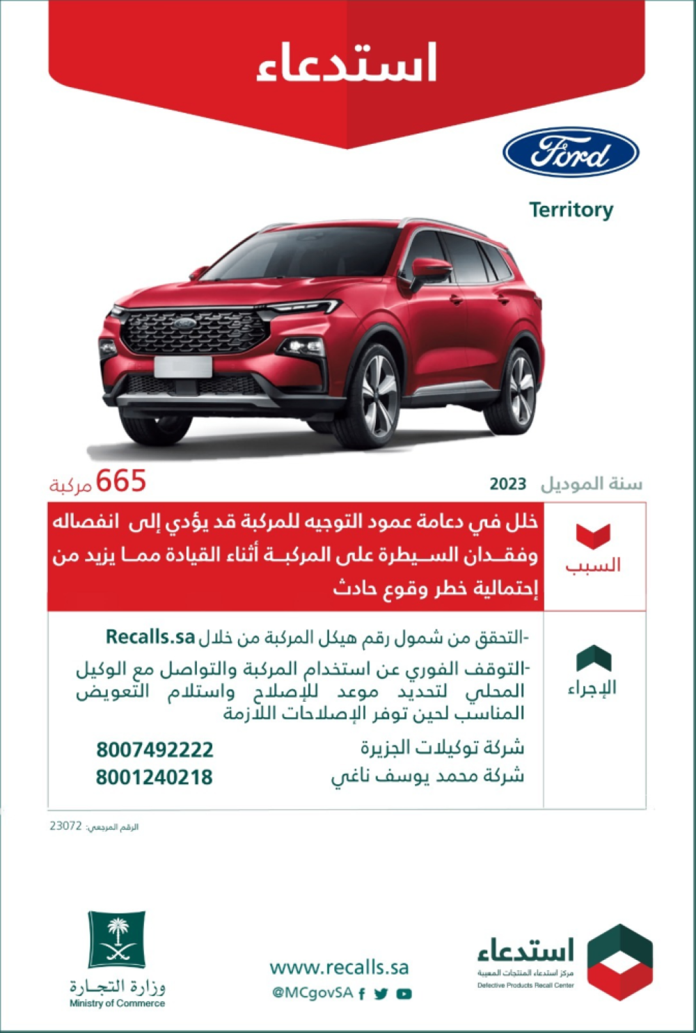كما دعت أصحاب المركبات إلى التحقق من شمول رقم هيكل المركبة بحملة الاستدعاء من خلال موقع مركز استدعاء المنتجات المعيبة، والتواصل مع الوكيل المحلي شركة توكيلات الجزيرة وشركة محمد يوسف ناغي لإجراء الإصلاحات اللازمة مجاناً.