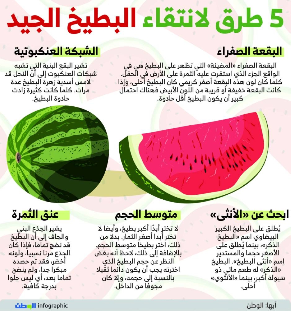 البقعة الصفراء «المضيئة» التي تظهر على البطيخ هي في الواقع الجزء الذي استقرت عليه الثمرة على الأرض في الحقل. كلما كان لون هذه البقعة أصفر كريمي كان البطيخ أحلى، وإذا كانت البقعة خفيفة أو قريبة من اللون الأبيض فهناك احتمال كبير أن يكون البطيخ أقل حلاوة.