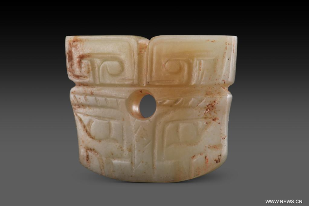 قطعة من اليشم مكتشفة في موقع «تشايقو» الأثري، الذي يعود تاريخه إلى نحو 3200 عام، بمحافظة تشينغجيان في مقاطعة شنشي شمال غربي الصين .«شينخوا»