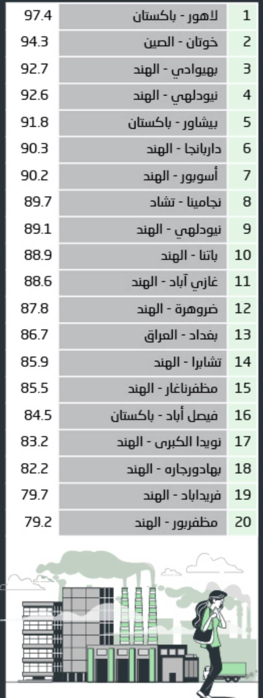 كأحد مؤشرات جودة الهواء القياسية التي تستخدمها منظمة الصحة العالمية، يشير تركيز PM2.5 إلى كمية الجسيمات الدقيقة التي يبلغ قطرها 2.5 ميكرومتر أو أقل في حجم معين من الهواء. يمكن للجسيمات الدقيقة بهذا الحجم أن تخترق الرئتين عند استنشاقها، وتدخل مجرى الدم، مما يؤثر على جميع الأعضاء الرئيسية. ومع ارتفاع هذه الأرقام، يكون تركيز بعض أو كل الملوثات التالية عند مستويات خطيرة في هذه المدن: الأوزون على مستوى الأرض - الجسيمات الدقيقة - أول أكسيد الكربون - ثاني أكسيد الكبريت - ثاني أكسيد النيتروجين. رتبة 2022 - متوسط تركيز PM2.5 (ميكروجرام / متر مكعب)