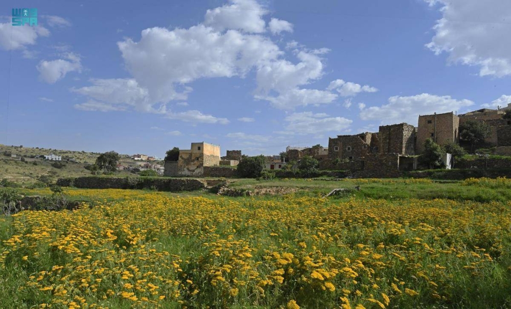 وأسهمت الأمطار الغزيرة التي يتواصل هطولها على المرتفعات والسهول منذ أكثر من شهر في إنماء الغطاء النباتي وتشكل لوحات طبيعية تتوسطها الآثار العريقة التي يعود تاريخ بعضها إلى ما يزيد على الـ«300 عام». (واس)