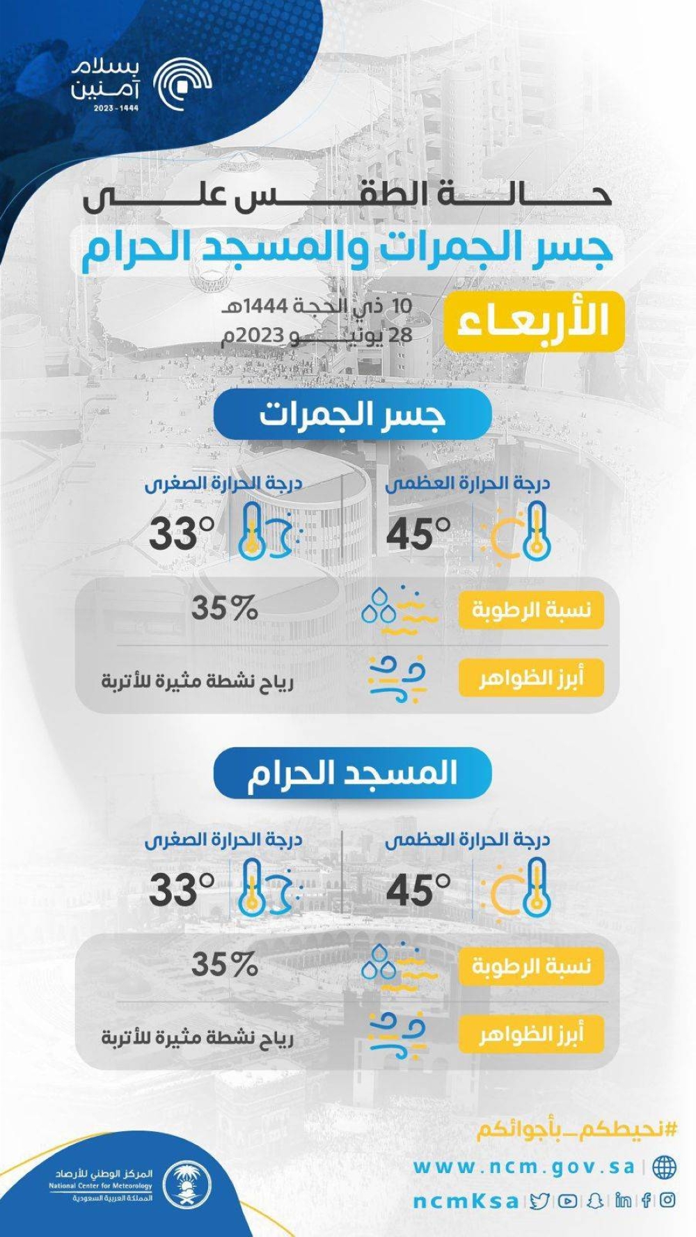 حيث تصل درجة الحرارة العظمى على المسجد الحرام و جسر الجمرات إلى 45 درجة مئوية، فيما تكون الصغرى حوالي 33 درجة مئوية، إضافة إلى رياح نشطة مثيرة للأتربة.