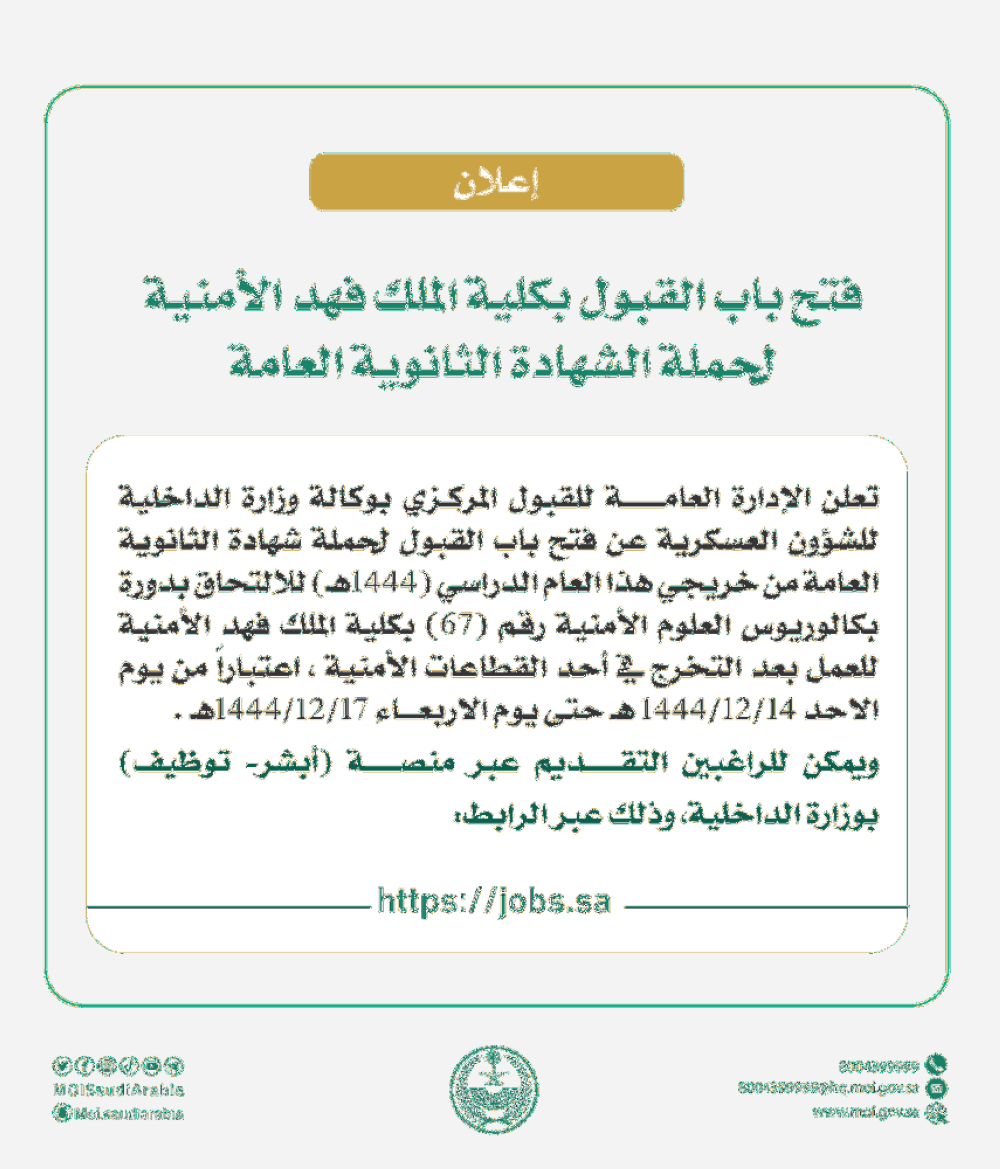 ونوّهت إلى أنه سيتم لاحقًا الإعلان عن أسماء المرشحين للقبول مبدئيًا عبر إرسال رسالة نصية لجوال المتقدم، وعلى المتقدمين متابعة منصة أبشر توظيف بوزارة الداخلية ووسائل التواصل الرسمية، وتسجيل البيانات المطلوبة في منصة أبشر توظيف بكل دقة، ويتحمل الطالب مسؤولية صحة تلك البيانات، وللجهة المختصة الحق في استبعاد الطلبات غير المكتملة أو التي تحمل بيانات غير صحيحة واتخاذ الإجراءات القانونية المتعلقة بذلك كافة، كما أن إدخال البيانات في المنصة والحصول على رقم طلب لا يعني قبول المتقدم، وسيحدد موعد اختبار كفايات اللغة الإنجليزية (step) لاحقًا.