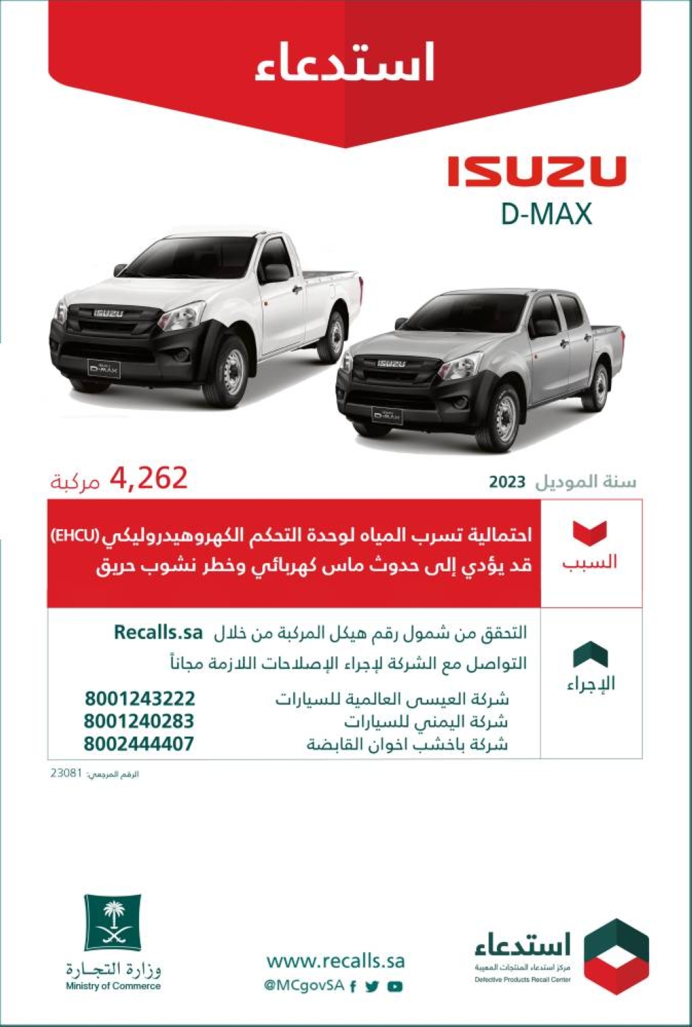 ودعت مستخدمي هذه المركبات إلى التحقق من شمول رقم هيكل المركبة بحملة الاستدعاء من خلال موقع مركز استدعاء المنتجات المعيبة (Recalls.sa)، والتواصل مع شركة