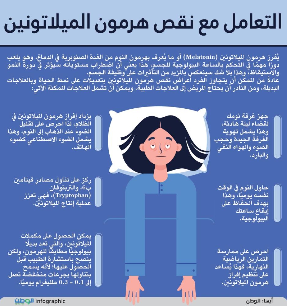 - يمكن الحصول على مكملات الميلاتونين، والتي تعد بديلًا بيولوجيًا مطابقًا للهرمون، ولكن ينصح باستشارة الطبيب قبل الحصول عليها؛ لأنه يسمح بتناولها بجرعات منخفضة تصل إلى 0.1 - 0.3 ملليغرام يوميًا.
