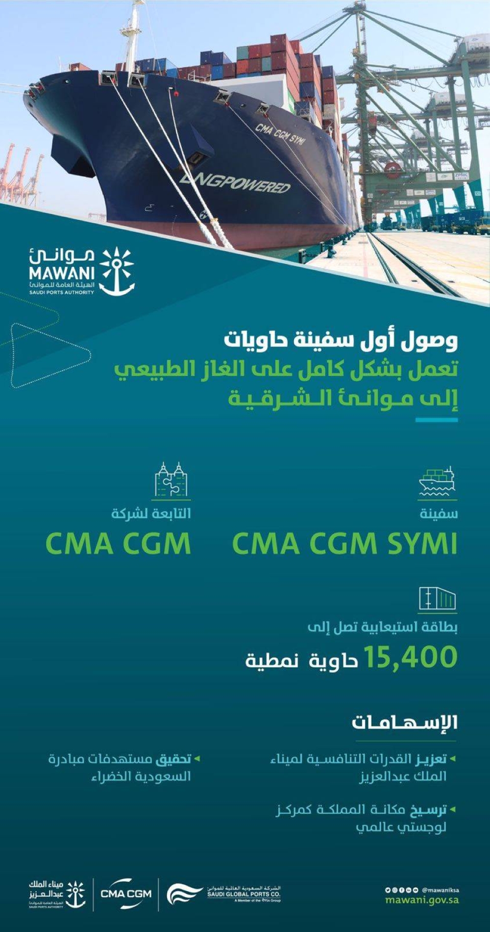 وتبلغ الطاقة الاستيعابية للسفينة 15,400 حاوية نمطية، فيما يبلغ طولها 366 متراً، وعرضها 51 متراً، وعمقها يبلغ 16 متراً، وتم اكتمال دخولها الخدمة عام 2022، وتتبع للخط الملاحي الفرنسي (CMA CGM)، ويأتي ذلك استمراراً للشراكة الإستراتيجية التي عقدتها "موانئ" مع الشركة الرائدة في مجال النقل البحري العالمي (CMA CGM)، مما يسهم في استغلال موقع المملكة الإستراتيجي وزيادة قوة ربط موانئها مع موانئ العالم، تماشياً مع مستهدفات الإستراتيجية الوطنية للنقل والخدمات اللوجستية. ويعد وصول السفينة (CMA CGM SYMI) تأكيداً لما تحظى به الموانئ السعودية من جاهزية عالية لاستقبال هذا النوع من السفن، ويعزز من موقع المملكة كمركز لوجستي رائد، ومحور ربط للقارات الثلاث، كما يزيد من القدرات التنافسية التي يمتلكها ميناء الملك عبدالعزيز بالدمام، ومشغل محطتي الحاويات الشركة السعودية العالمية للموانئ "SGP" من معدات لوجستية عالية التقنية، التي تُعزز قدراته التشغيلية لمناولة مختلف أنواع البضائع والحاويات.