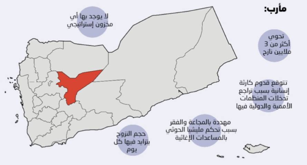 وأضاف: «لا يوجد، اليوم، أي مخزون إستراتيجي في مأرب، ولا توجد أي تدخلات حقيقية لمواجهة المشكلات الموجودة، سواء في الجانب الغذائي أو الصحي أو التعليمي، أو الإيوائي، وهناك غياب كامل لتدخلات المنظمات، خصوصا بعد الهدنة الأممية».
