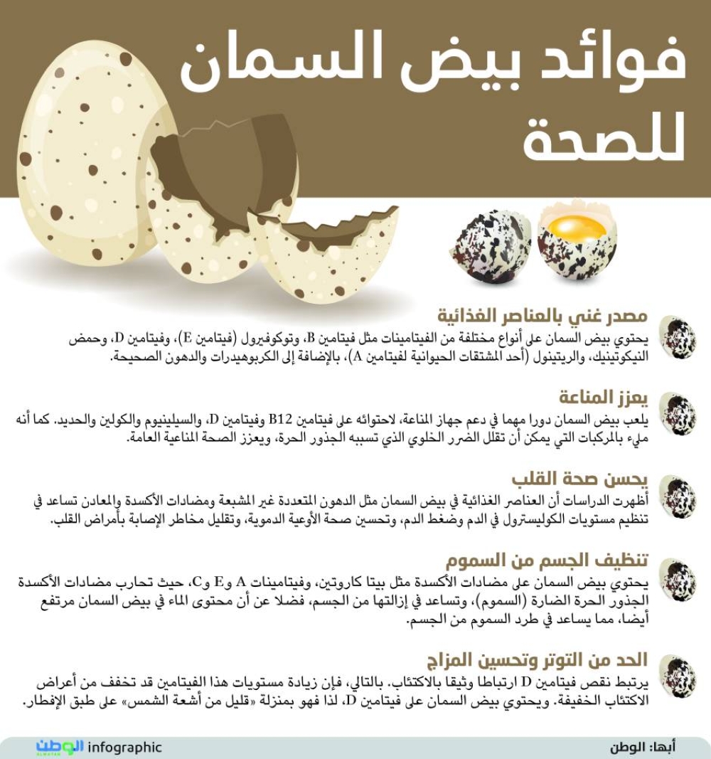 يحتوي بيض السمان على مضادات الأكسدة مثل بيتا كاروتين، وفيتامينات A وE وC، حيث تحارب مضادات الأكسدة الجذور الحرة الضارة (السموم)، وتساعد في إزالتها من الجسم، فضلا عن أن محتوى الماء في بيض السمان مرتفع أيضا، مما يساعد في طرد السموم من الجسم.
