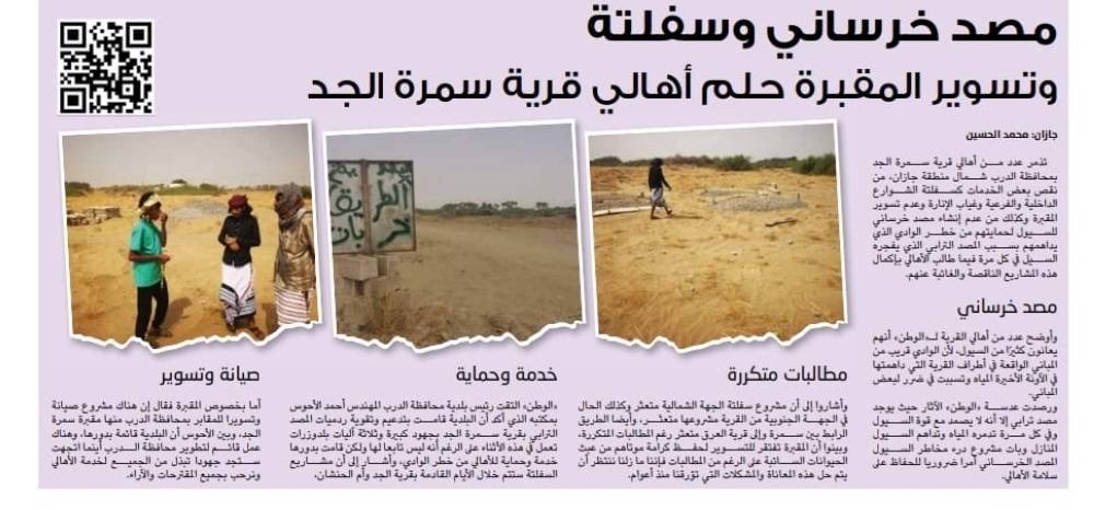 استجابة لما نشر في «الوطن» بعنوان «مصد خرساني وسفلتة وتسوير المقبرة حلم أهالي قرية سمرة الجد»، شرعت بلدية محافظة الدرب في أعمال السفلتة بقرية سمرة الجد، ورصد سكان جهود البلدية وآلياتها في أعمال السفلتة بدءا من طريق الحزام إلى بقية الشوارع التي كانت تفتقر للسفلتة. كما قامت البلدية بتقوية ردميات المصد. (جازان: محمد الحسين)