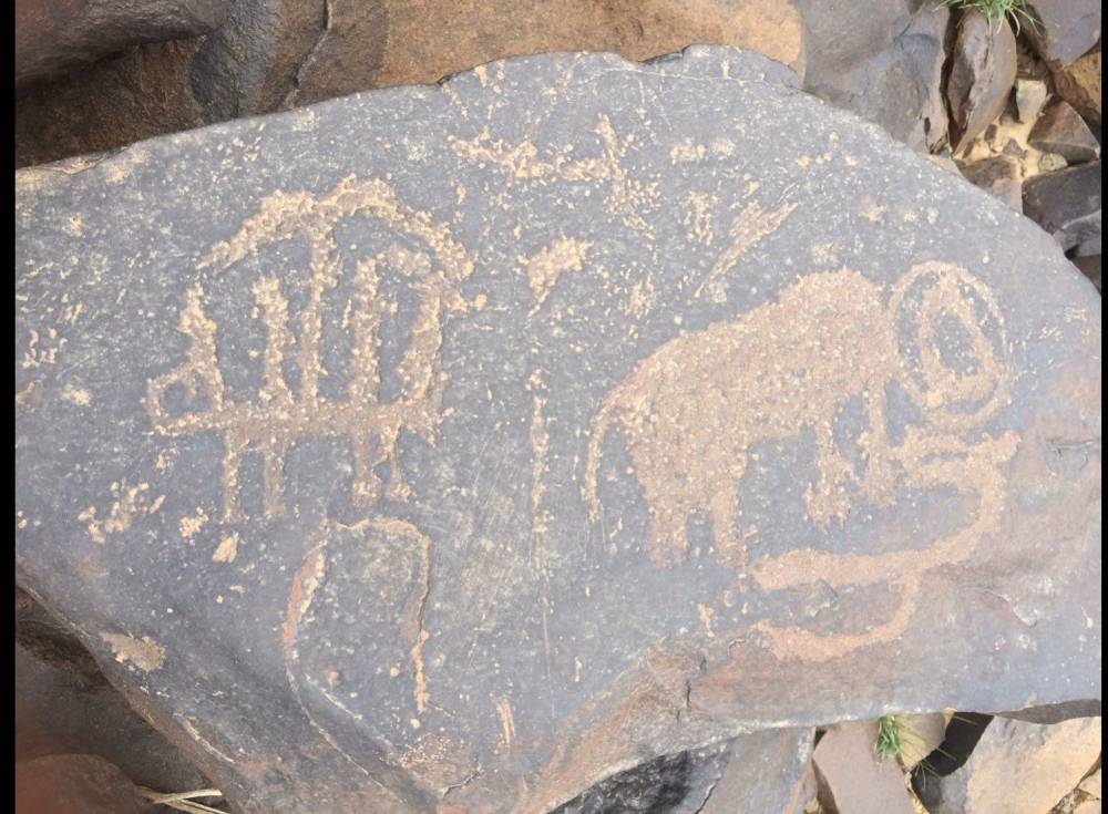 6- النقوش الصخرية من أشخاص وفيلة وأسود وطيور وغزلان وغيرها، عوضا عن النقوش بالخط الثمودي المسند والنقوش العربية من القرن الإسلامي الأول دون تنقيط.