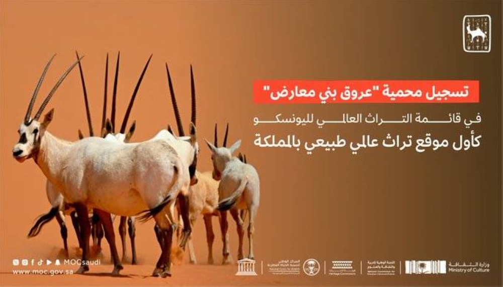 وجاء إدراج محمية "عروق بني معارض" في قائمة التراث العالمي لليونسكو نتيجةً للجهود الوطنية المشتركة من وزارة الثقافة، واللجنة الوطنية للتربية والثقافة والعلوم، والمركز الوطني لتنمية الحياة الفطرية، وهيئة التراث، وذلك ضمن مستهدفات رؤية السعودية 2030، والمتمثل في الوصول بعدد المواقع السعودية المدرجة في قائمة اليونسكو للتراث العالمي إلى الضعف؛ لتنضم بذلك إلى ستة مواقع سعودية أخرى مسجلة، وهي: واحة الأحساء، وحي الطريف في الدرعية، وموقع الحِجر الأثري، ومنطقة حمى الثقافية، وجدة التاريخية، والفنون الصخرية في منطقة حائل.