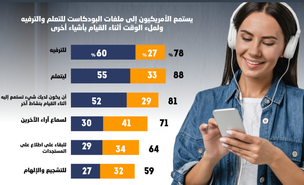 وفي الوقت نفسه، فإن السبب الرئيسي الأكثر شيوعًا الذي يشير إليه مستمعو البودكاست الذين يبلغون من العمر 65 عامًا فما فوق للاستماع إلى البودكاست هو التعلم (61%).