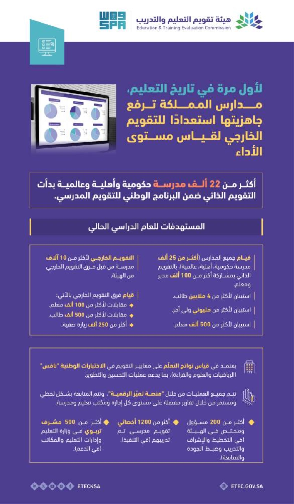 ولأول مرة في تاريخ التعليم، ينفذ هذا البرنامج، ويشارك فيه أكثر من 1200 أخصائي تقويم مدرسي من الهيئة، وبدعم أكثر من 500 مشرف تربوي من وزارة التعليم وإدارات ومكاتب التعليم، وتخطيط وإشراف أكثر من 200 من مسؤولي الهيئة.