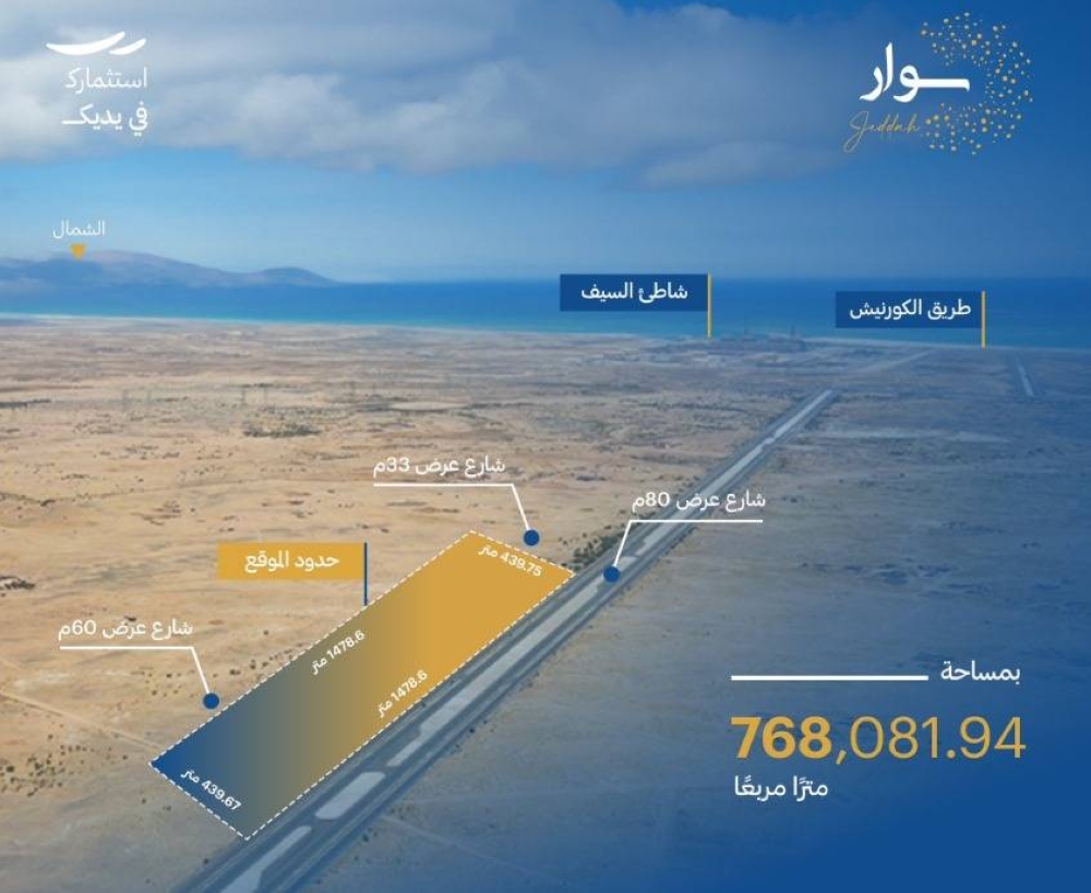 وأشار "سليمان الحربي" نائب الرئيس التنفيذي لشركة أدير العقارية، إلى أن مشروع "سوار" يحتضن أرض خام فريدة من نوعها، تمتد على مساحة إجمالية تبلغ 768,081.94 مترًا مربعًا، تتميز بموقعها الاستراتيجي في حي "المليساء" جنوب مدينة جدة، وسط بيئة استثمارية عالية الجودة.