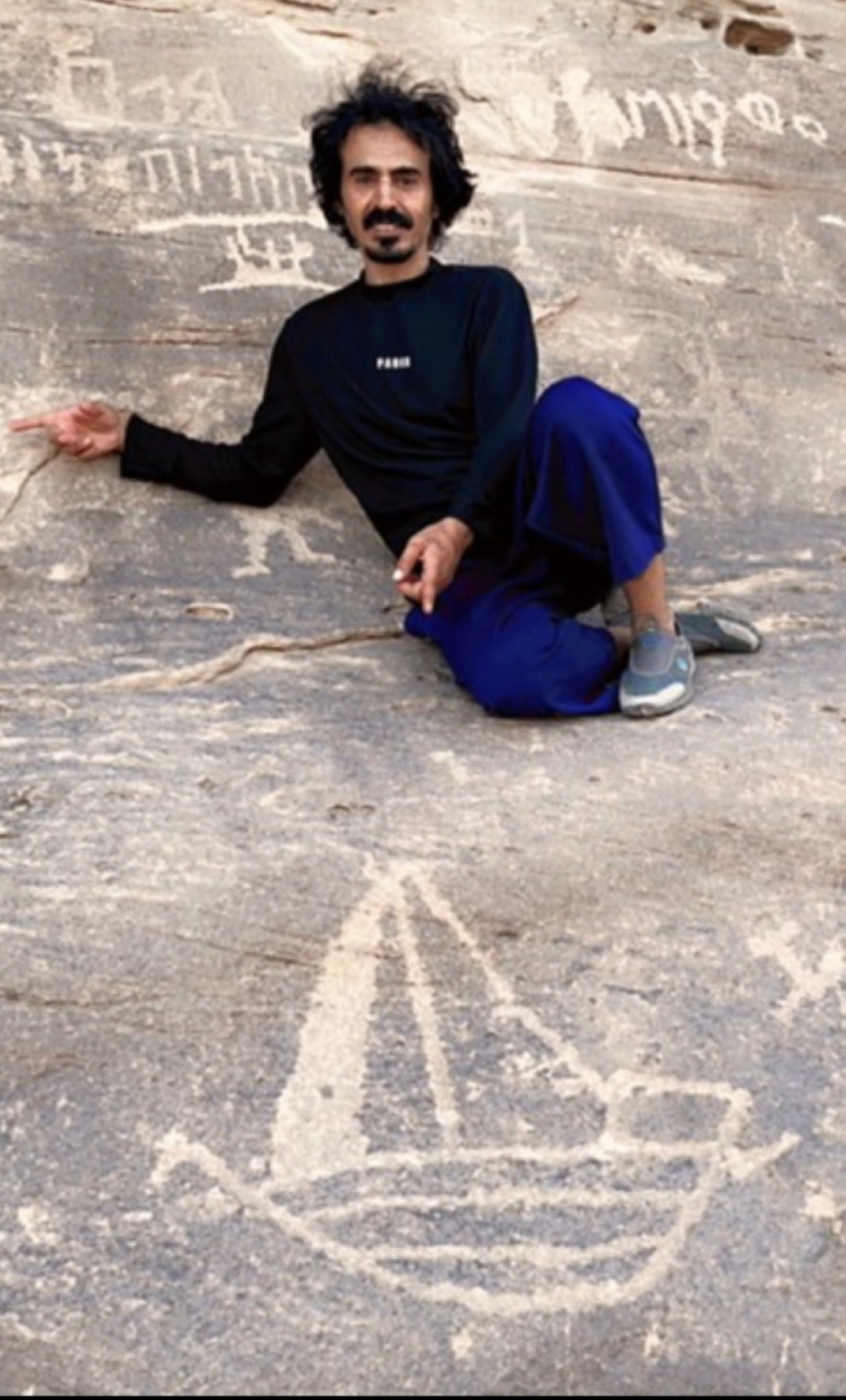 وكشف عن تلك اللوحة الصخرية التي تحمل نقش ورسمة السفينة أحد أهم المهتمين بعلوم الآثار بالمنطقة وأبنائها مشعل عبدالله والذي قال: اكتشفت رسمة صخرية قديمة لسفينة وبجوارها نقش غريب حروفه تشبه الحروف الآرامية ربما يكون له علاقة بالرسمة. ولأن هذا الاكتشاف نادر وفريد من نوعه أهديه إلى الدولة التي أزاحت الستار عن كنوزنا الأثرية لتكون وجهة سياحية للعالم.
