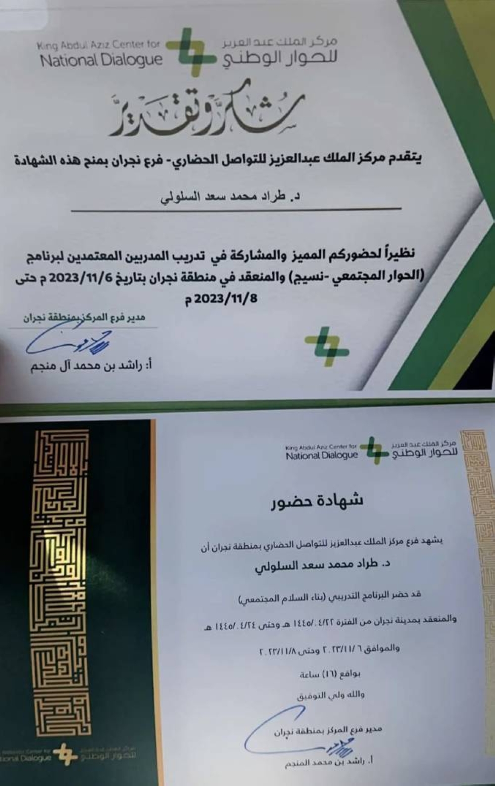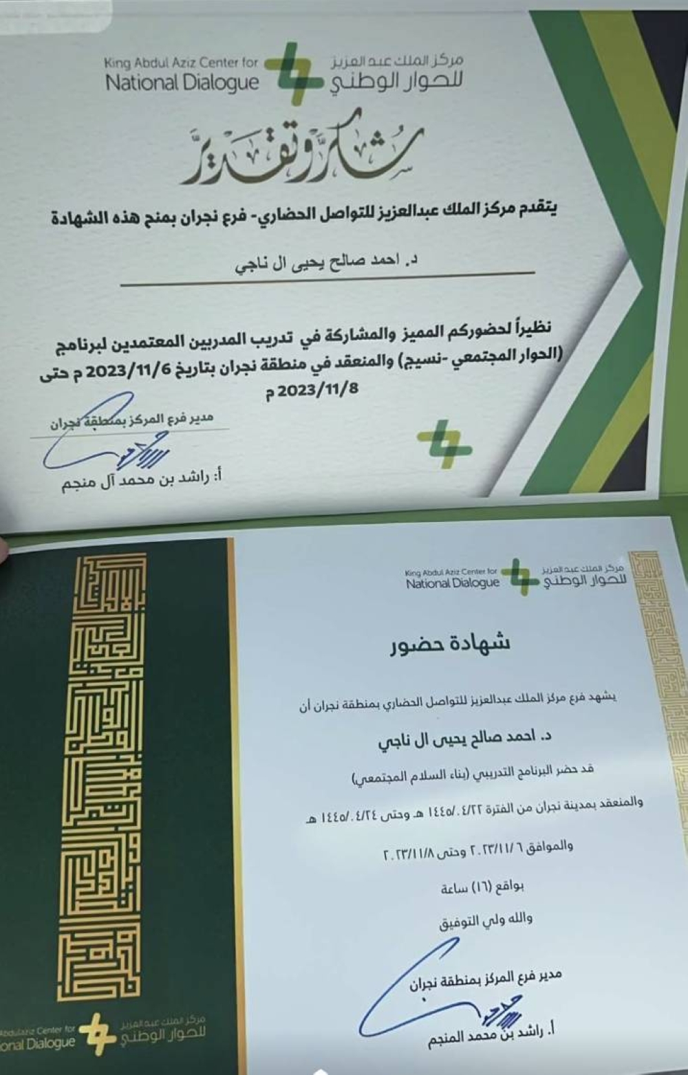 منح مركز الملك عبدالعزيز للحوار الوطني الدكتور أحمد صالح يحي آل ناجي والدكتور طراد محمد سعد السلولي شهادة شكر وتقدير وكذلك شهادة حضور نظير حضورهم المميز، والمشاركة في تدريب المدربين المعتمدين لبرنامج "الحوار المجتمعي - نسيج"، الذي عقد مؤخرا بمنطقة نجران.