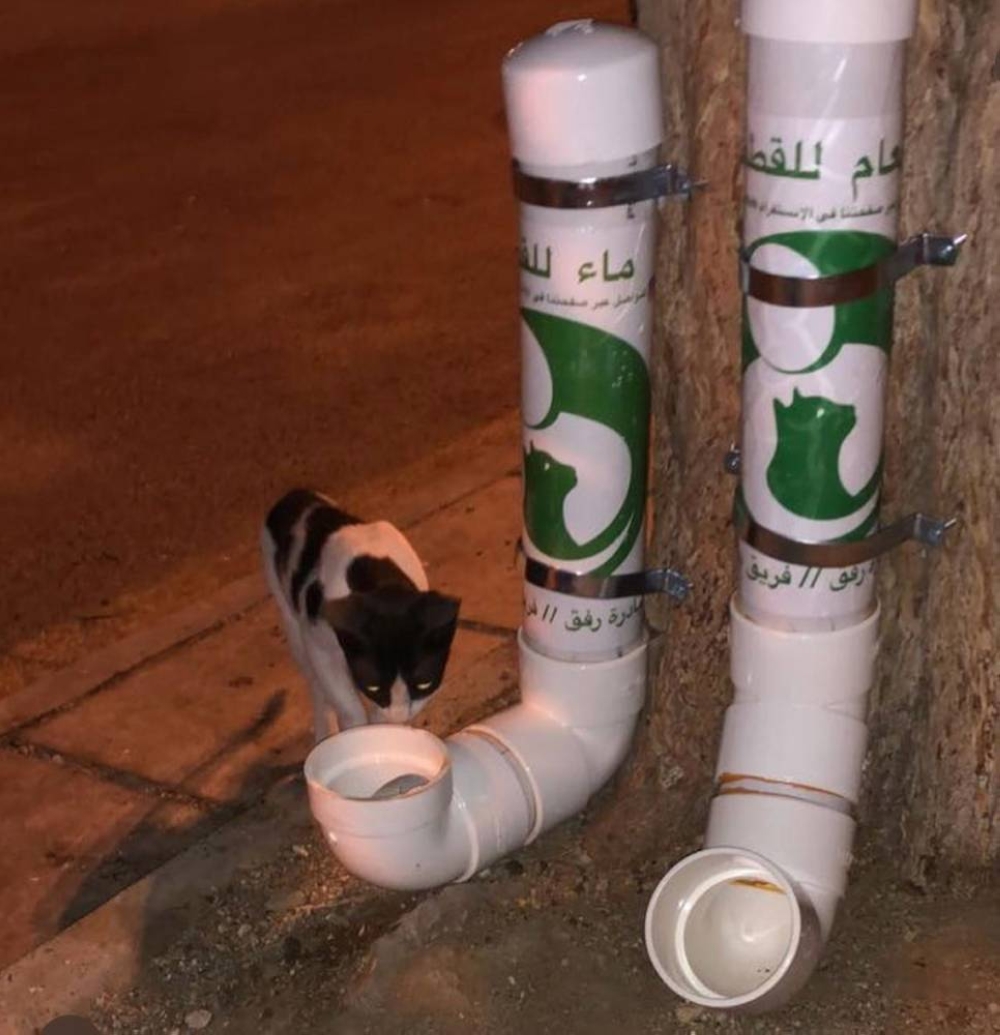 بادر فريق «رفق جدة» إلى إطعام القطط عن طريق توفير أنابيب يوضع بها الطعام بطريقة جذابة وتحافظ على نظافة البيئة إلى جانب أنابيب المياه.