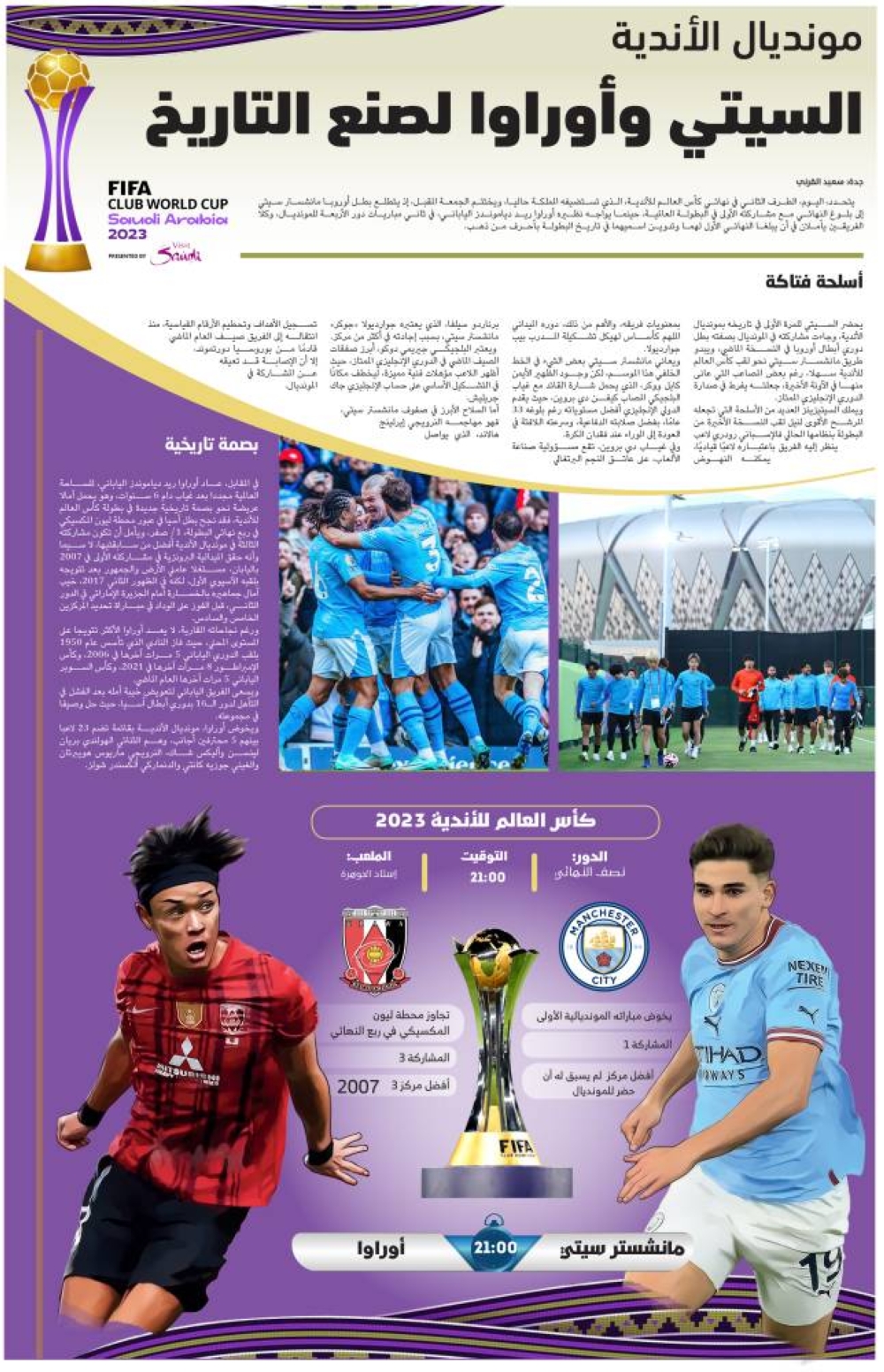 في المقابل، عاد أوراوا ريد دياموندز الياباني، للساحة العالمية مجددا بعد غياب دام 6 سنوات، وهو يحمل آمالا عريضة نحو بصمة تاريخية جديدة في بطولة كأس العالم للأندية، فقد نجح بطل آسيا في عبور محطة ليون المكسيكي في ربع نهائي البطولة، 1/ صفر، ويأمل أن تكون مشاركته الثالثة في مونديال الأندية أفضل من سابقتيها، لا سيما وأنه حقق الميدالية البرونزية في مشاركته الأولى في 2007 باليابان، مستغلا عاملي الأرض والجمهور بعد تتويجه بلقبه الآسيوي الأول، لكنه في الظهور الثاني 2017، خيب آمال جماهيره بالخسارة أمام الجزيرة الإماراتي في الدور الثاني، قبل الفوز على الوداد في مباراة تحديد المركزين الخامس والسادس.