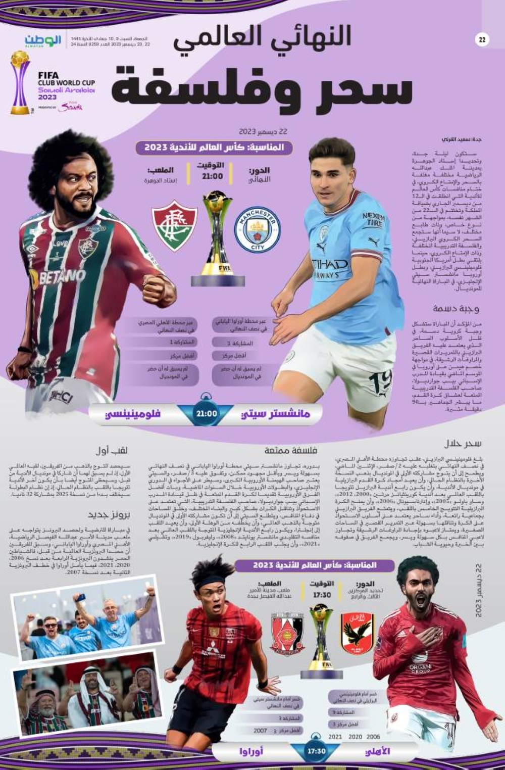 بدوره، تجاوز مانشستر سيتي محطة أوراوا الياباني في نصف النهائي بسهولة ويسر وبأقل مجهود ممكن، وتفوق عليه 3/صفر، والسيتي يعتبر صاحب الهيمنة الأوروبية الكبرى، وسيطر على الأجواء في الدوري الإنجليزي، والبطولات الأوروبية خلال السنوات الماضية، وبات أفضل الفرق الأوروبية تقديما لكرة القدم الممتعة في ظل قيادة المدرب الإسباني بيب جوارديولا، صاحب الفلسفة التدريبية، التي تعتمد على الاستحواذ وتناقل الكرات بشكل كبير والبناء المختلف، وخلق المساحات في دفاع المنافس، ويتطلع السيتي إلى أن تكون مشاركته الأولى في المونديال متوجة بالذهب العالمي، وأن يخطفه من الوهلة الأولى، وأن يعيد اللقب إلى إنجلترا، ويكون رابع الأندية الإنجليزية المتوجة باللقب العالمي بعد منافسه التقليدي مانشستر يونايتد «2008»، وليفربول «2019»، وتشيلسي «2021»، وأن يجلب اللقب الرابع للكرة الإنجليزية.