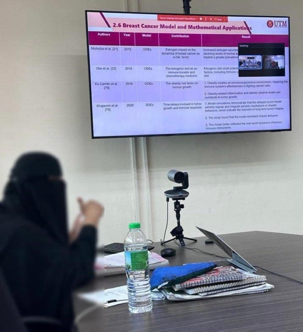 حصلت الطالبة، عبير حمدان البلوي، من ‫جامعة حائل‬ على درجة الدكتوراة من جامعة ماليزيا للتكنولوجيا تخصص الرياضيات التطبيقية برسالة تحت عنوان «نمذجة رياضية لنظام تفاعل الخلايا السرطانية والمناعية تحت تأثير الجلوكوز وتأخير الوقت وعلاج التحكم الأمثل».